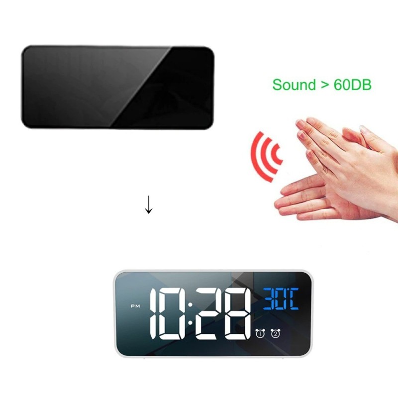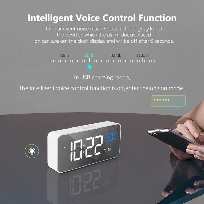 Стилният дизайн на часовника не само гарантира лесното прочитане на времето, но и ви позволява да избирате от различни режими. Можете да зададете режим на звуково активиране, когато часовникът не е свързан към електрическо захранване, той автоматично преминава в енергоспестяващ режим. Просто свирнете, плеснете с ръце или го потупайте, за да активирате функцията, и дисплеят на часовника ще светне за 8 секунди, преди да се изключи отново.