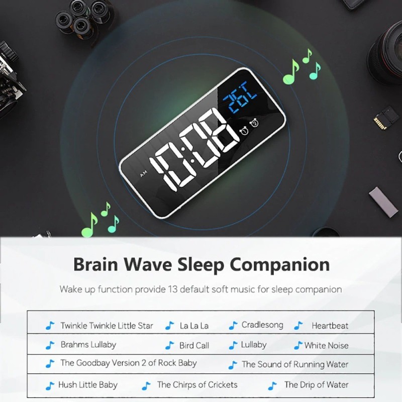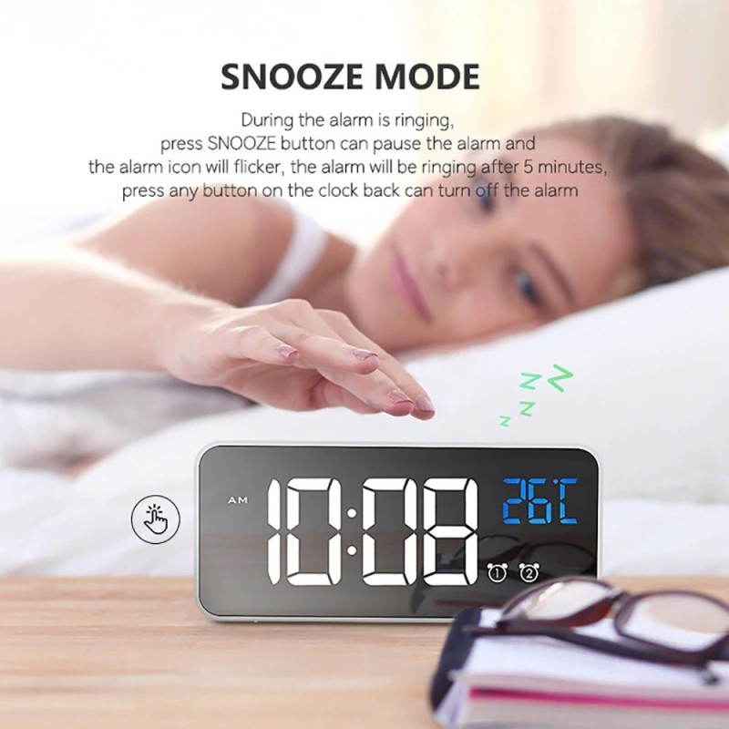 Този настолен часовник е снабден с две аларми, които ви позволяват да зададете две отделни аларми за събуждане. Всяка аларма продължава 2 минути, ако искате да отложите звука, просто докоснете корпуса и активирайте функцията Snooze, която ще отложи алармата за 5 минути.