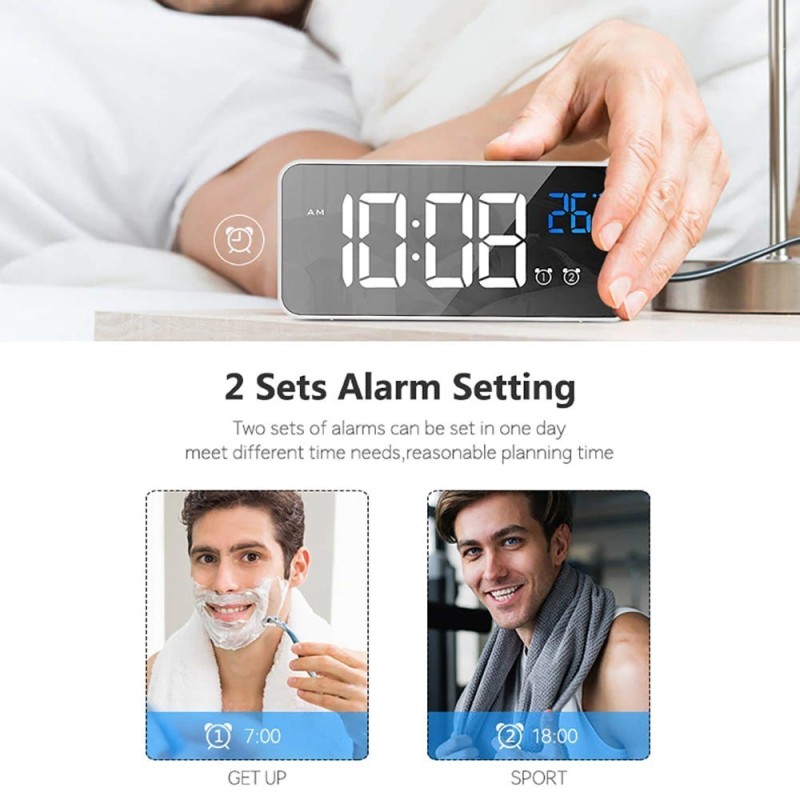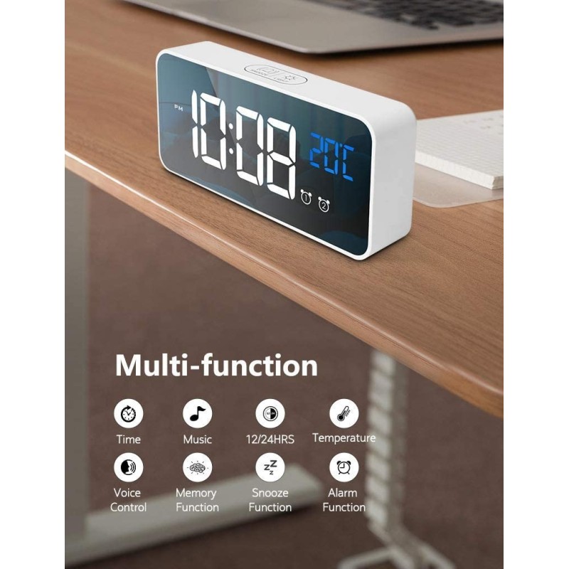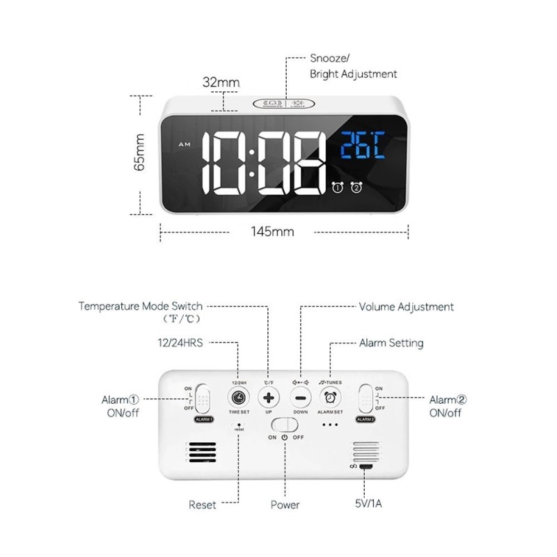 Този настолен часовник не само показва времето, но и датата и будилниците си, което го прави перфектен за вашата ежедневна организация. С вградената си акумулаторна батерия можете да го използвате навсякъде, без да се притеснявате за захранването. Ако предпочитате постоянно захранване, можете да го свържете директно към USB източник на 5V или да закупите допълнителен адаптер за 220V.