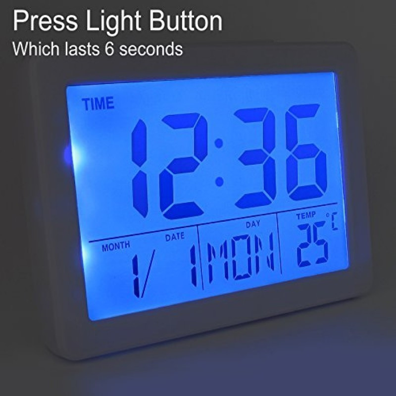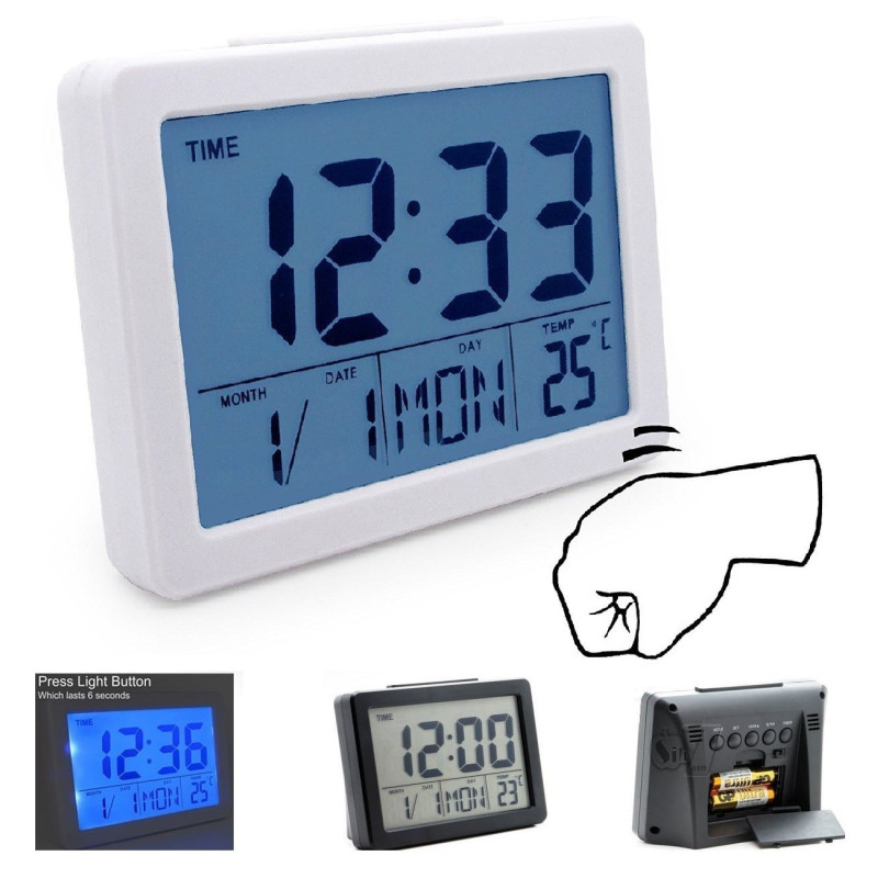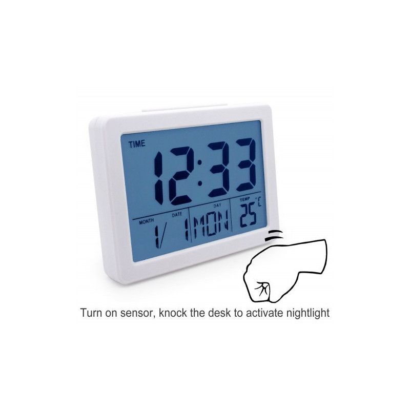 Големият дисплей на часовника е снабден с големи и ясни цифри, така че винаги ще можете лесно да видите времето, датата и температурата от голямо разстояние. Не е необходимо да се пробуждате и да търсите копчета, за да настроите часовника - просто използвайте гласа си, почукайте по бюрото или дори пляскайте, и часовникът ще се активира и покаже желаната информация.