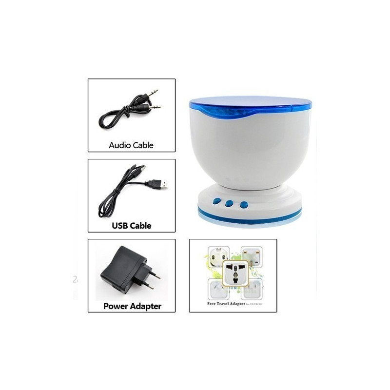 Комплектът включва LED Проектор с тон колона - Ocean Wave, USB кабел, 3.5 мм стерео кабел и MP3 плейър (допълнителна опция за допълнително заплащане). Уредът работи както на батерии (4 x AA, не са включени), така и от зарядно за GSM с USB изход.
