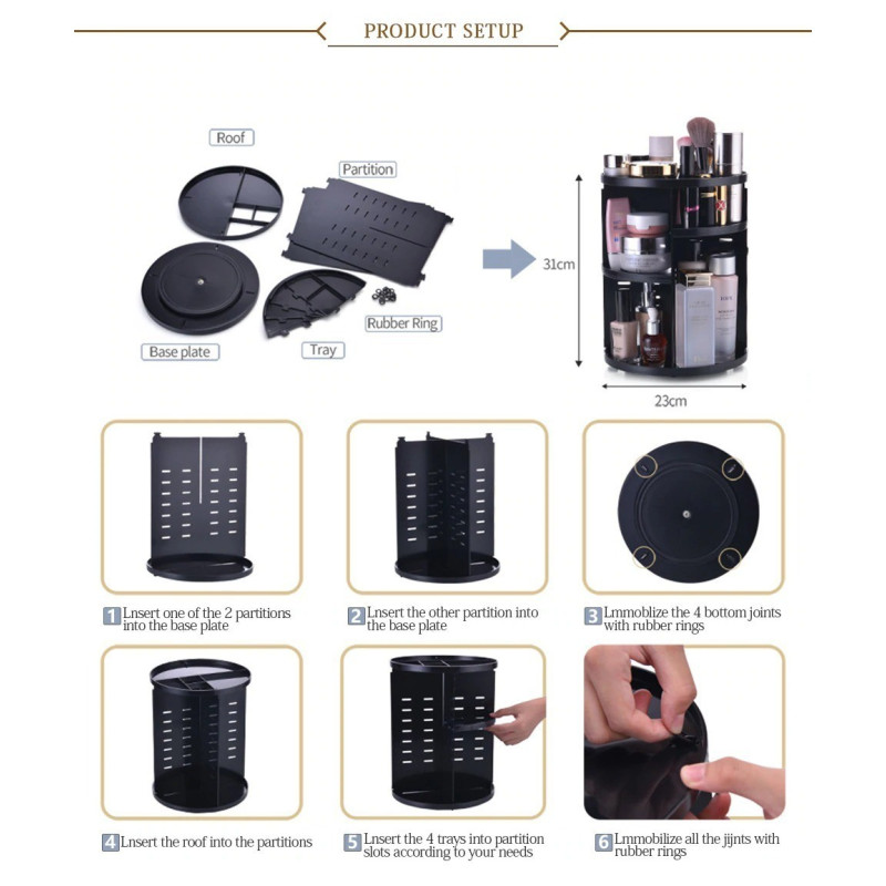 Този органайзер е идеалното допълнение към Вашата домашна гримьорна. С възможността да се върти на 360 градуса, той не само чудесно подрежда всички използвани от Вас продукти, но и спестява много място. Никога повече няма да трябва да търсите нужния продукт, защото всичко ще бъде на едно място.