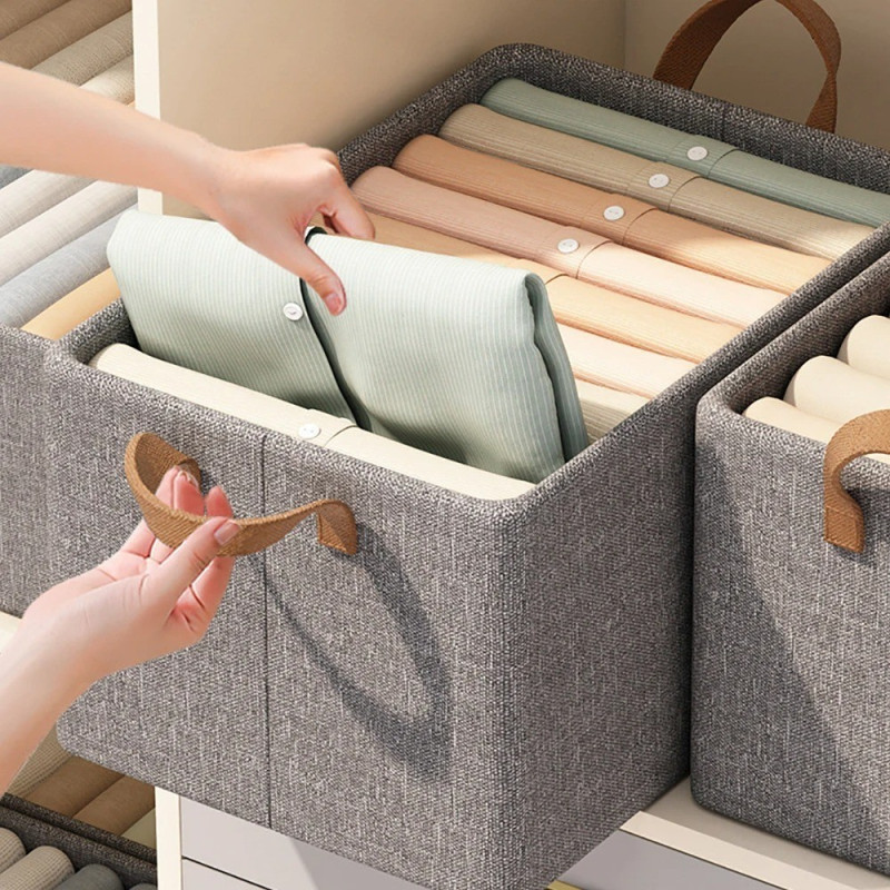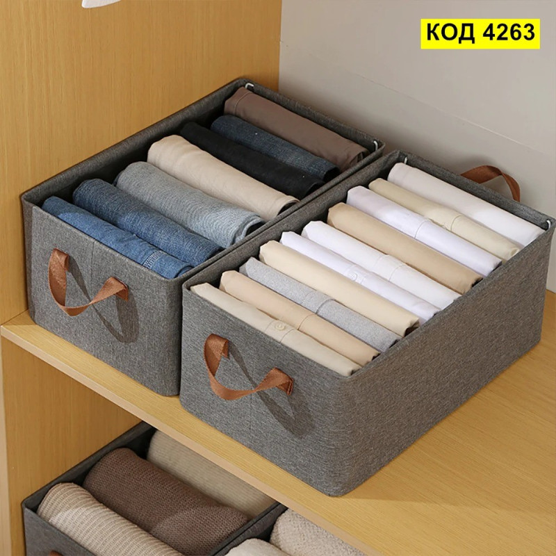 Текстилна кутия за гардероб, идеална за организиране и съхранение на дрехи и аксесоари. Сгъваемата конструкция на кутията я прави удобна за съхранение, когато не се използва, оптимизирайки пространството във вашия гардероб. Проектирана с просторност и издръжливост, тя предлага мрежеста предна част с качествени шевове, осигуряващи дълготрайност и устойчивост на деформации. Подредете ефективно вашите дрехи и аксесоари с тази практична и стилна текстилна кутия.