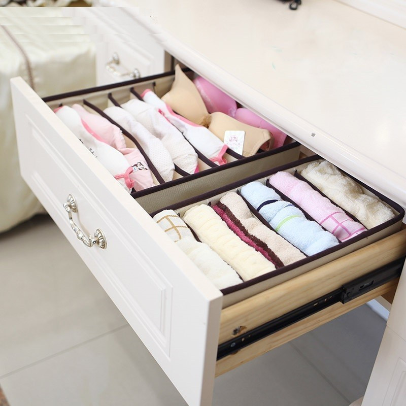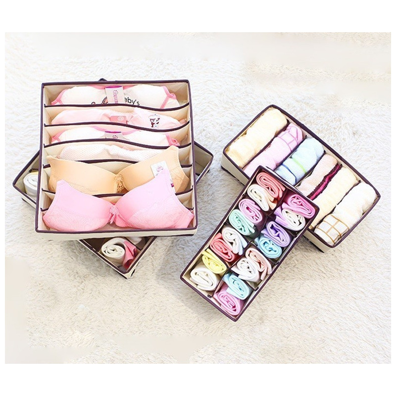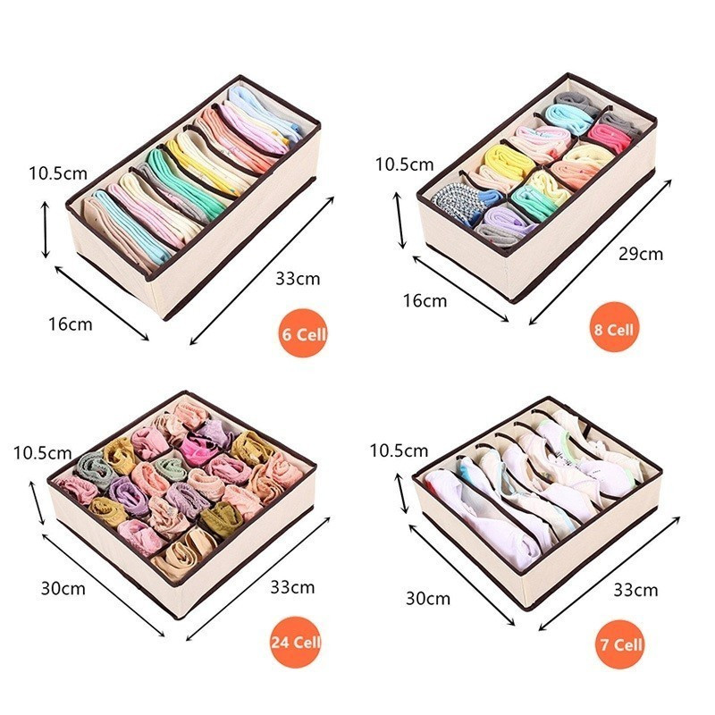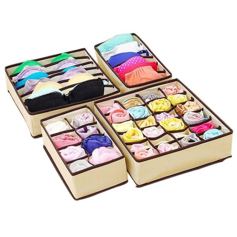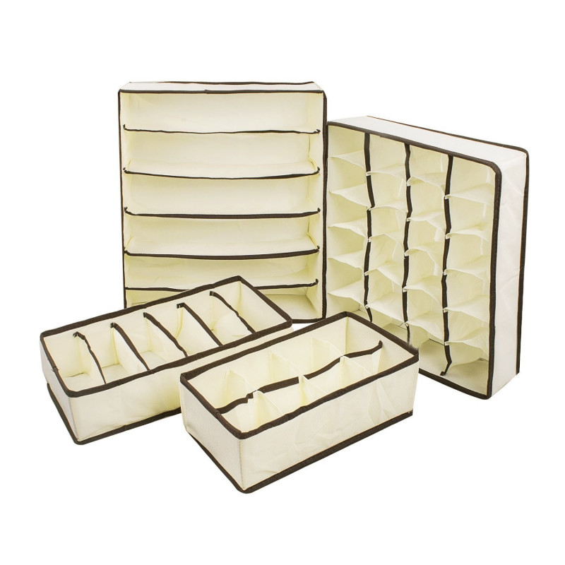 С комплекта от 4 броя сгъваеми кутии, ще си сложите край на хаоса в гардероба. Всяка кутия е с подходящи разделения, които са идеални за съхранение на сутиени, чорапи, вратовръзки, бельо и други малки аксесоари. Вие получавате не една, а цели четири кутии, в които можете да съхранявате всичко, което ви е необходимо.