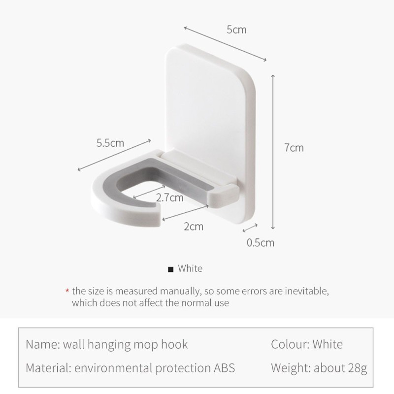 Сгъваемата закачалка е изработена от висококачествена пластмаса ABS, която осигурява здравина и дълготрайност на продукта. Тя е в бял цвят и има размери 7,5 х 5 х 0,6 см. Отворът, в който се поставя мопа, има диаметър от 2,7 см.