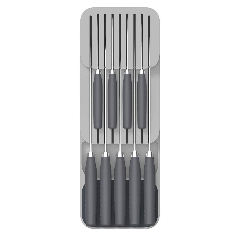 Органайзерът за чекмеджета за кухненски ножове е перфектното решение за всеки, който иска да подреди и организира своите ножове по начин, който да е безопасен и практичен. Този компактен органайзер е специално проектиран да съхранява до 8 ножа с различна дължина на острието. Сега вече няма да трябва да търсите ножовете си из разхвърляните чекмеджета, защото те ще бъдат надлежно прибрани и подредени в този оригинален органайзер.