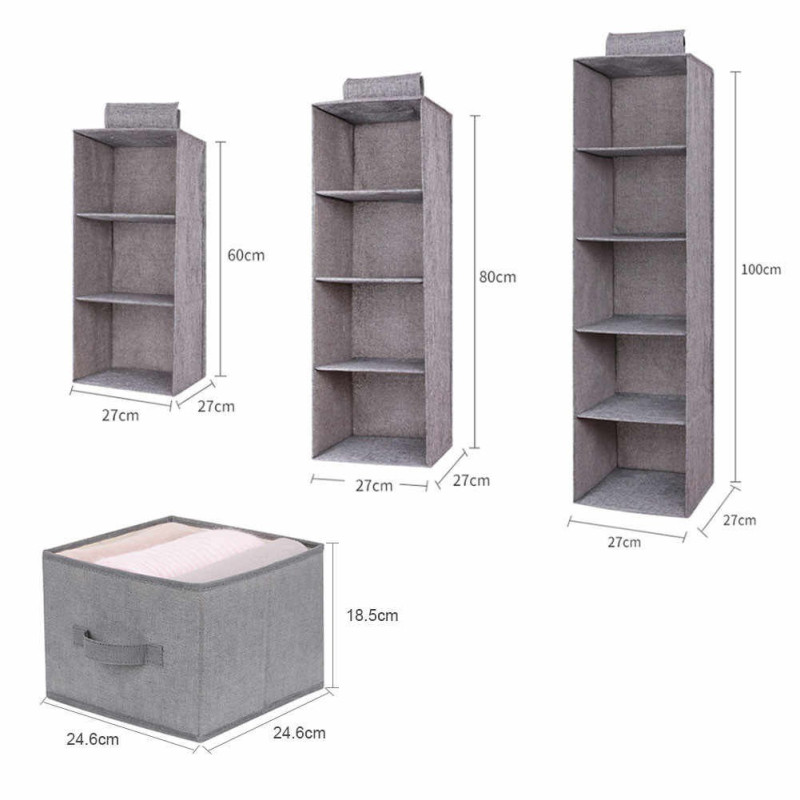 Органайзерът е изработен от висококачествен полиестерен оксфорд материал и е наличен в сив цвят. Той се предлага в размери на 3 нива (В 58 х Ш 26 х Д 27 см), на 4 нива (В 77х Ш 26 х Д 27 см) и на 5 нива (В 88 х Ш 26 х Д 27 см). Моля, имайте предвид, че кутията с размери В 17 х Ш 25,5 х Д 26,5 см е съвместима с органайзера, но се продава отделно.