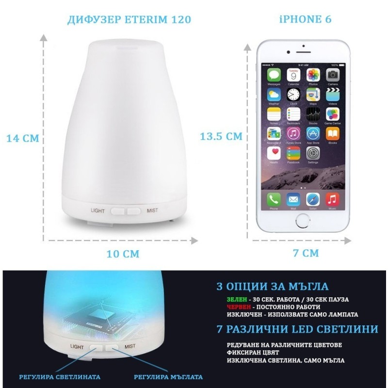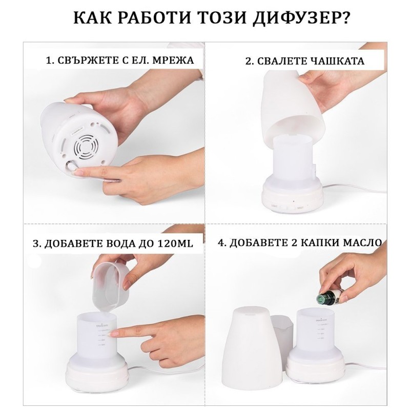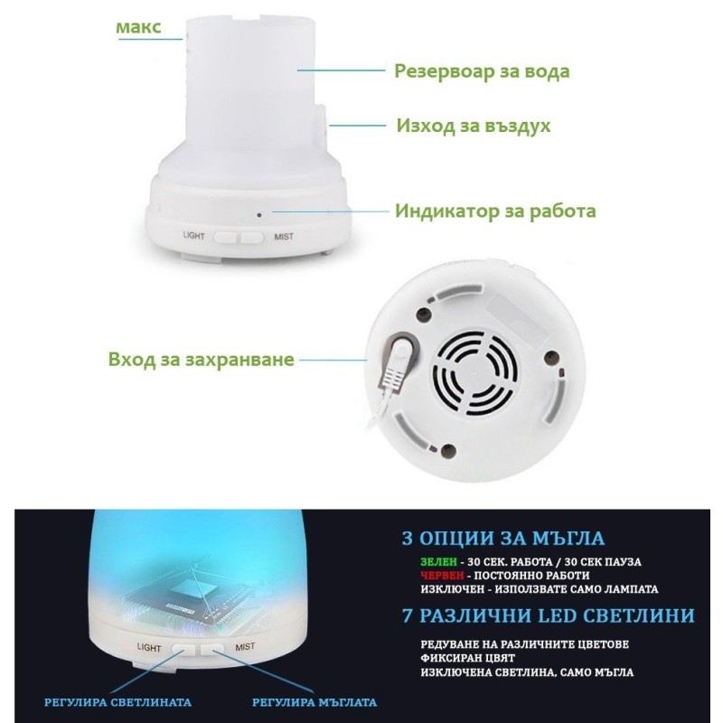 Но нашето устройство за ароматерапия не само предлага полезни свойства на етеричните масла, но и осигурява свеж и почиствен въздух във вашия дом. Дори и при наличието на климатик или парно, които изсушават въздуха, нашият арома дифузер ще върне необходимата влага в стаята.