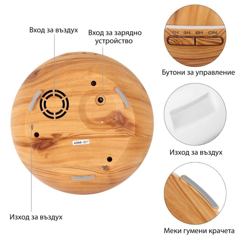 Комплектът включва арома дифузер, дистанционно управление, мерителна чашка и адаптер за захранване от ел. мрежата. Той е подходящ за помещения с площ до 40 кв.м. и има капацитет на резервоара от 400мл. Максималното време за работа е до 10 часа, а устройството се изключва автоматично при изпаряване на течността.