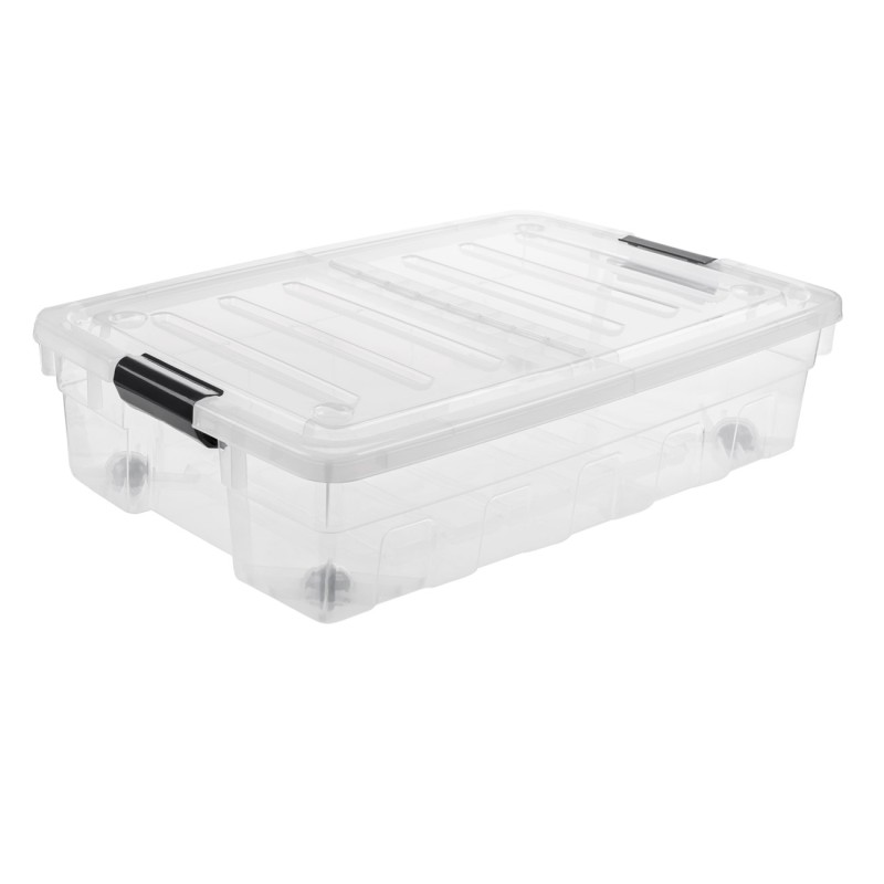 Κουτί αποθήκευσης πλαστικό διάφανο με καπάκι και χερούλια. Είναι πολύ πρακτικό για την ντουλάπα ή το ράφι και μπορείτε να δείτε εύκολα το περιεχόμενο του. Έχει χαμηλό ύψος και μπορεί να αποθηκευτεί και κάτω από το κρεβάτι.