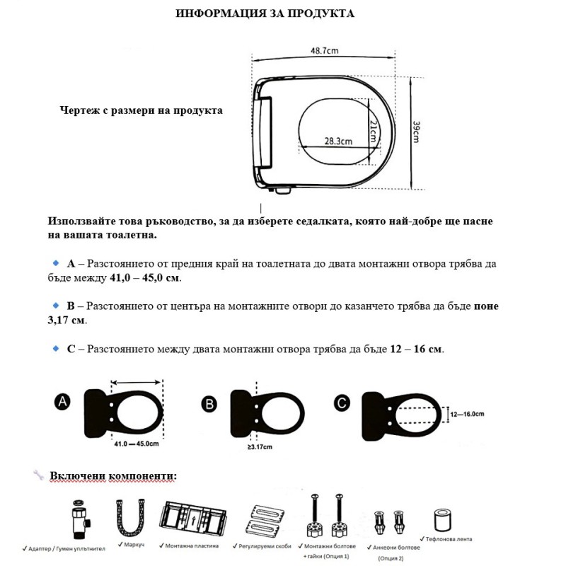 Размери на тоалетната седалка: обща дължина 48,7 см и широчина 36 см (+ 3,00см за страничния бутон)