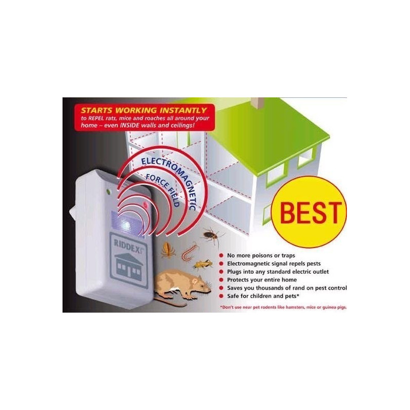 Riddex използва своя патентован цифров импулс, който променя електромагнитното поле във вашата електрическа мрежа. Това въздействие атакува нервната система на вредителите, като ги предлага със звук, сходен на постоянно пискене. Това означава, че гризачите и насекомите ще се чувстват неудобно и ще се отдалечат от вашата обитаема зона.