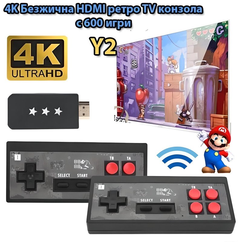 4К HDMI ретро конзола, която е 8 бита и разполага с нас 600 вградени игри. Свързва се изключително лесно и бързо, без да се налага да използвате допълнителни кабели. Всичко, което трябва да направите, е да поставите ретро конзолата в HDMI изхода на телевизора. Конзолата е удобна и можете да я носите навсякъде с вас, за да можете да се наслаждавате на любимите си игри.