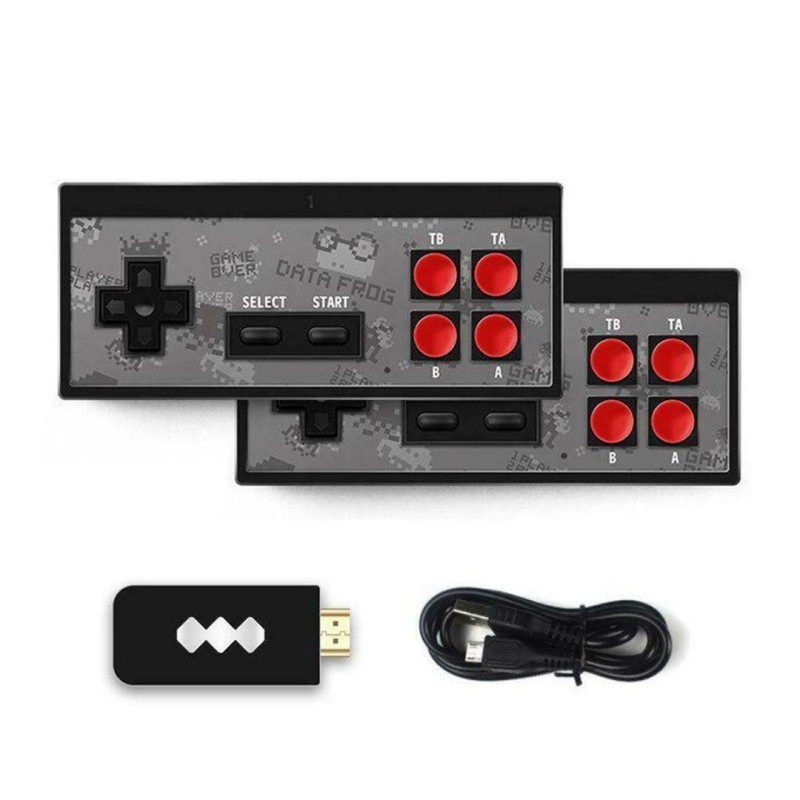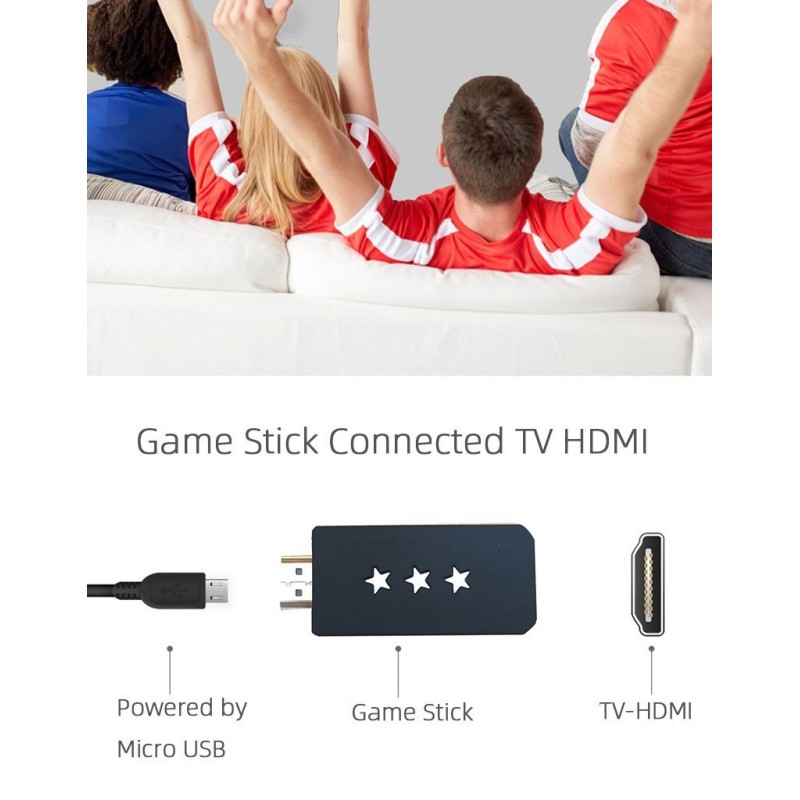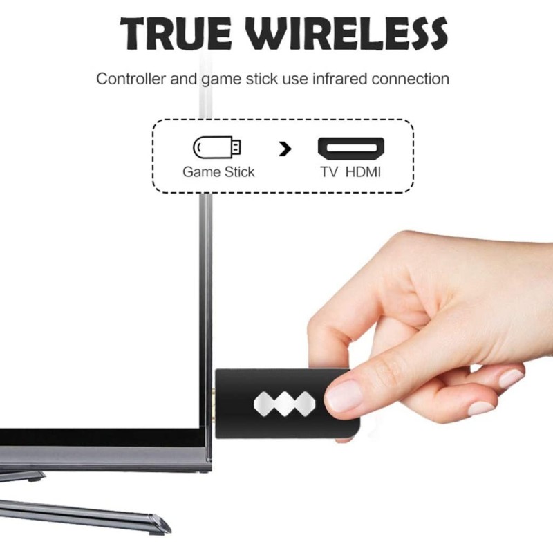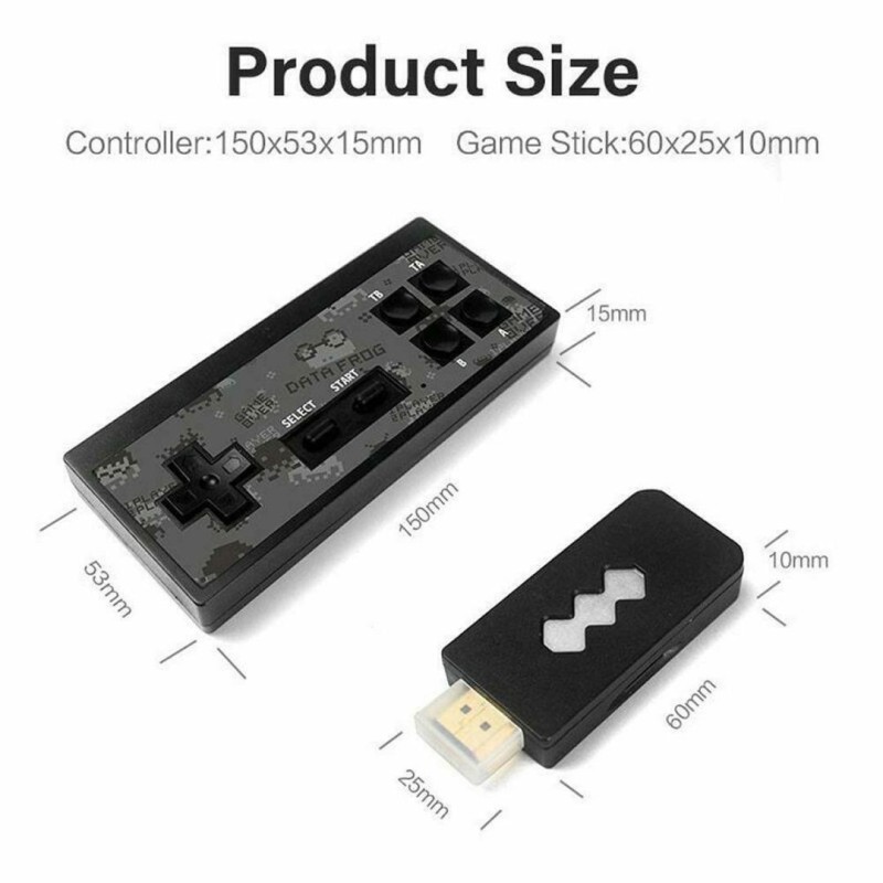 Размерите на HDMI устройството са компактни и наподобяват флашка, което го прави удобно за пренасяне и игра на всяко място. Можете да играете от двама играчи едновременно, а обхватът на джойстиците е до 8 метра.
