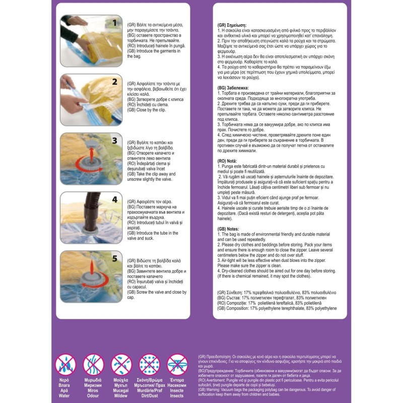 Нашите инструкции за употреба са много прости - просто поставете дрехите в торбичката, затворете я добре с клипса и използвайте прахосмукачката, за да изтеглите въздуха и да вакуумирате торбата. Това ви гарантира, че дрехите ще останат свежи и защитени от влага, миризми и прах.