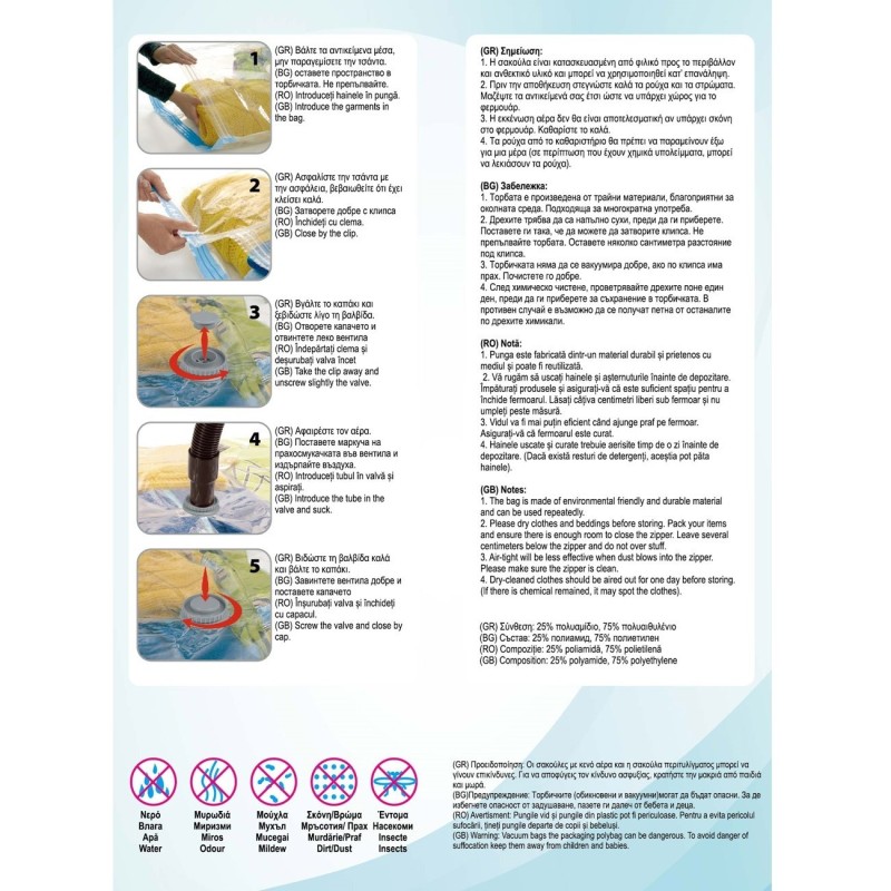 Използването на нашите пликове за вакуумиране е лесно като детска игра - просто подредете дрехите в торбата, затворете плика и вкарайте тръбата на прахосмукачката в отвора. След като включите прахосмукачката, дрехите ще се смачкат и намалят в обем. Когато сте доволни от резултата, спрете прахосмукачката и затворете капачето на плика. Вашите дрехи са готови за съхранение!