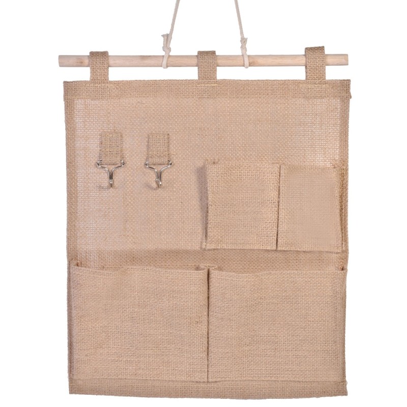 Кафявият висящ органайзер за стена от естествена материя представлява перфектното решение за организиране на различни предмети във вашия дом. Той е снабден с 4 функционални джобчета и две кукички, които могат да се използват за съхранение на кухненски прибори, аксесоари, бижута и много други.