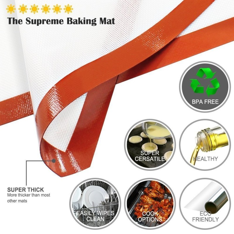 Важно е да споменем, че силиконовото килимче е одобрено за използване в хранителната индустрия и не съдържа вредни вещества като Бисфенол А, Меламин и Полиамиди. Изработено е от 100% безопасен за здравето фибростъклен плат с покритие от термо-устойчив силикон за печене. Това го прави устойчив, незалепващ и безопасен материал, специално проектиран да се използва с храни. Килимчето може да издържи на температури от -40 до 230 градуса по Целзий.