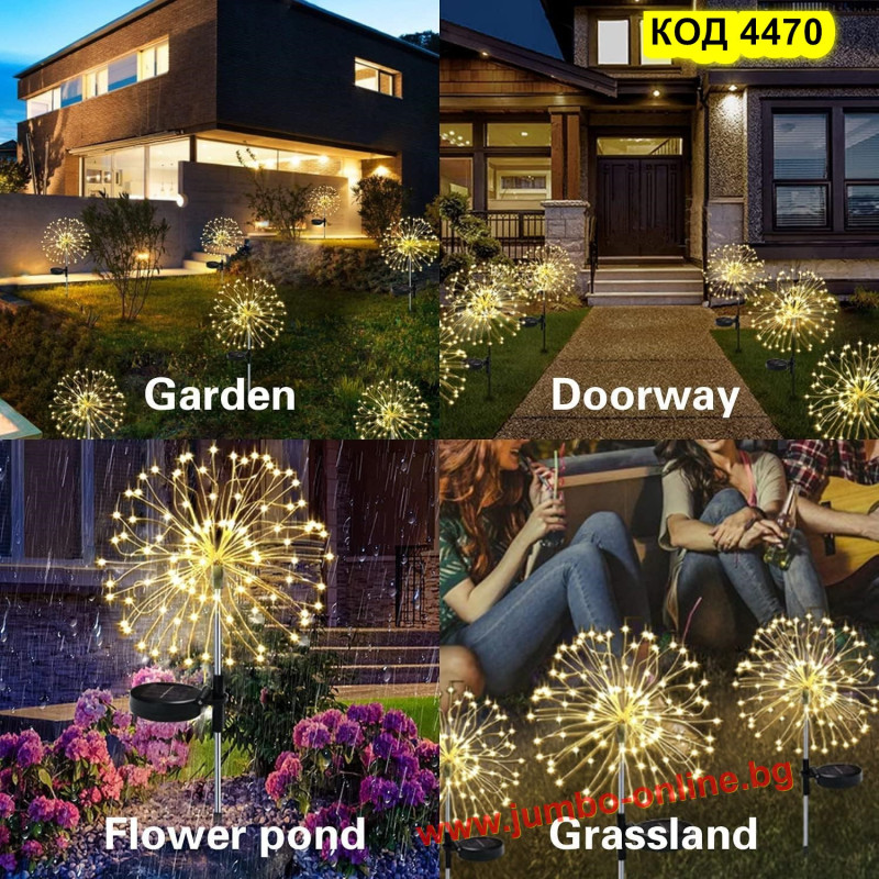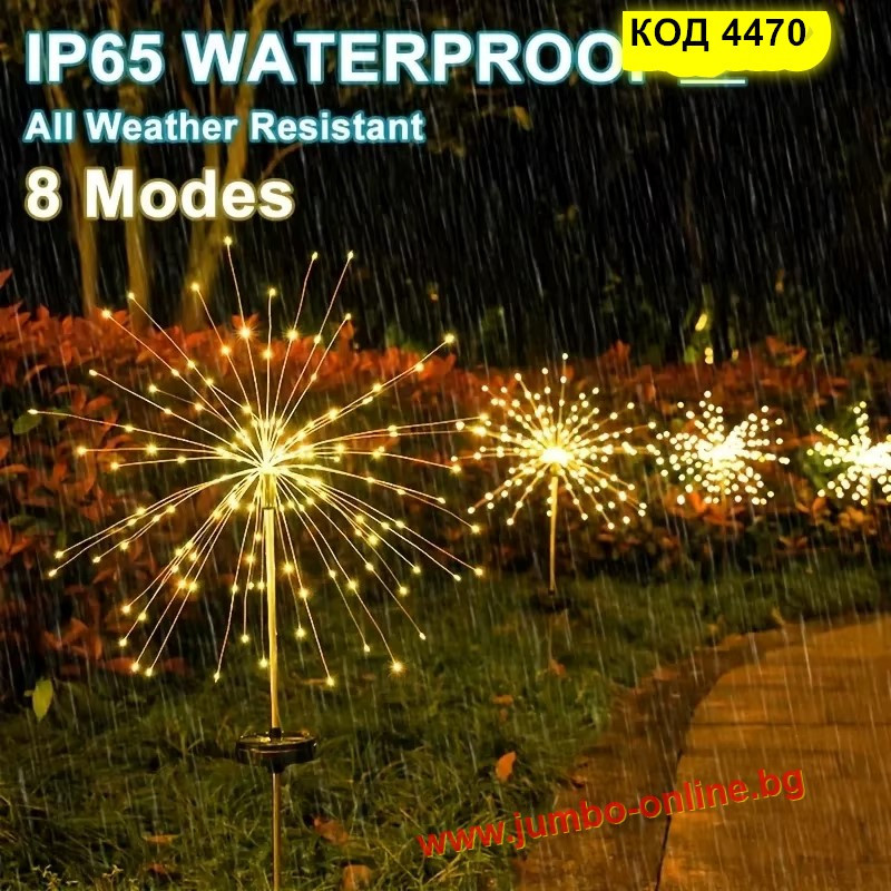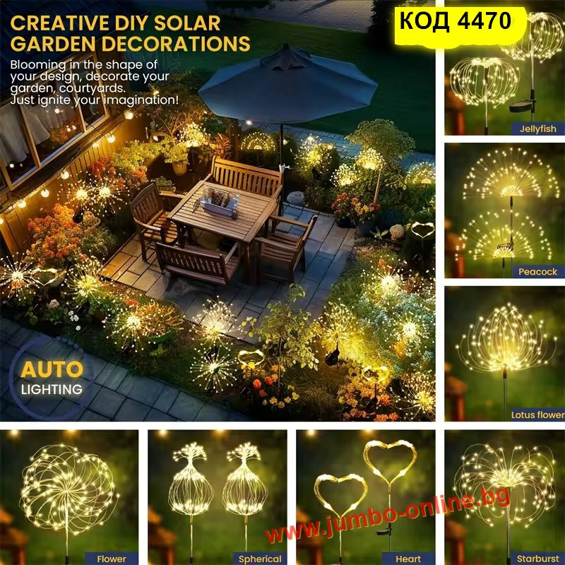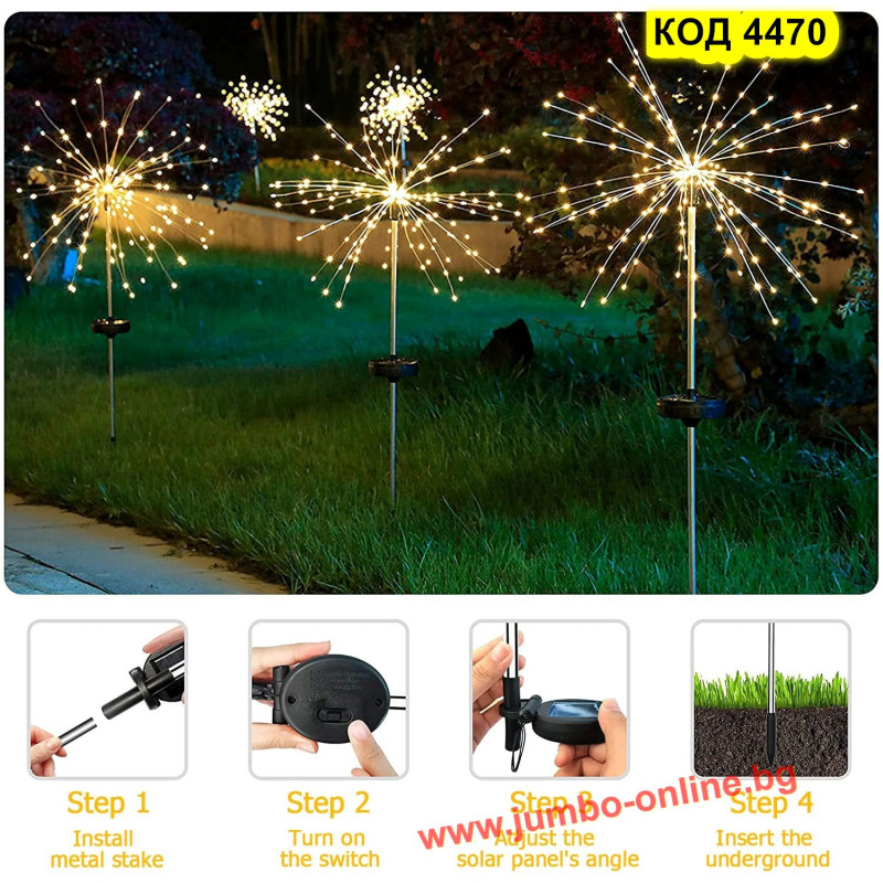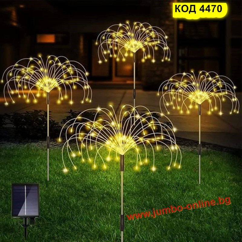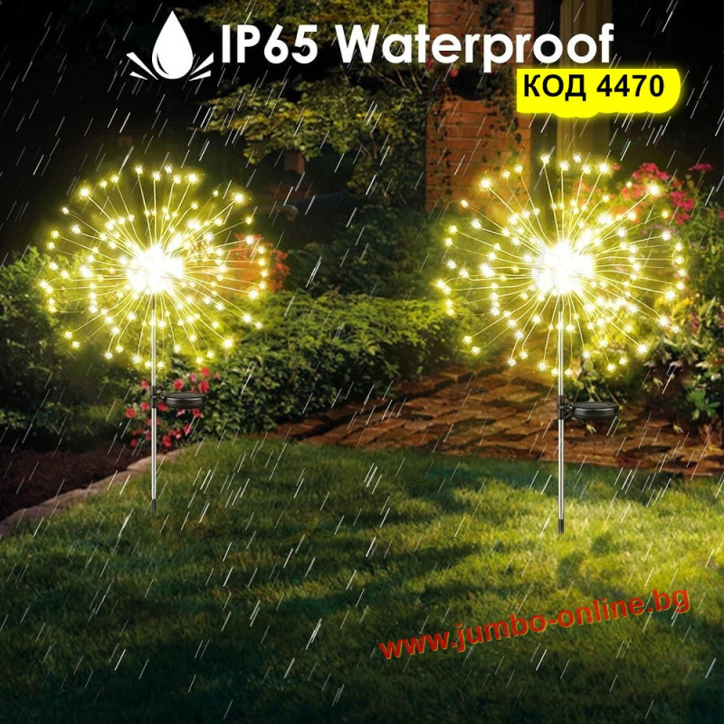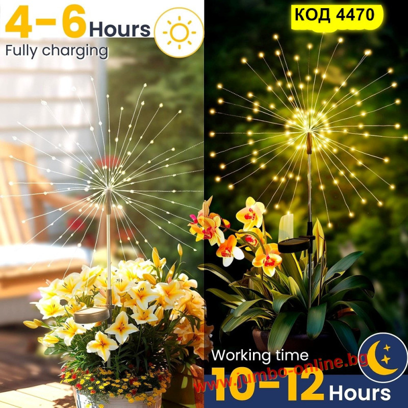 Пренесете нощното величие във вашия двор със соларната лампа за градина "Фойерверки". Този декоративен аксесоар е проектиран да подчертае природната красота на двора, създавайки ефект на звездно небе с мека, топла жълта светлина. Конструкцията е водойстойчива, което гарантира продължителна работа дори при влажни или дъждовни условия. Лампата "Фойерверки" е перфектен избор за тези, които търсят стилно и функционално решение за външно осветление. Съчетавайки модерния дизайн с практични функции като автоматично включване при здрач, тя осигурява уютна атмосфера и допринася за елегантното декориране на градината, терасата или двора ви.