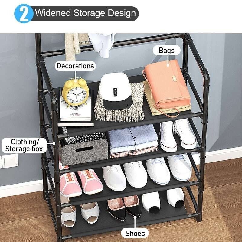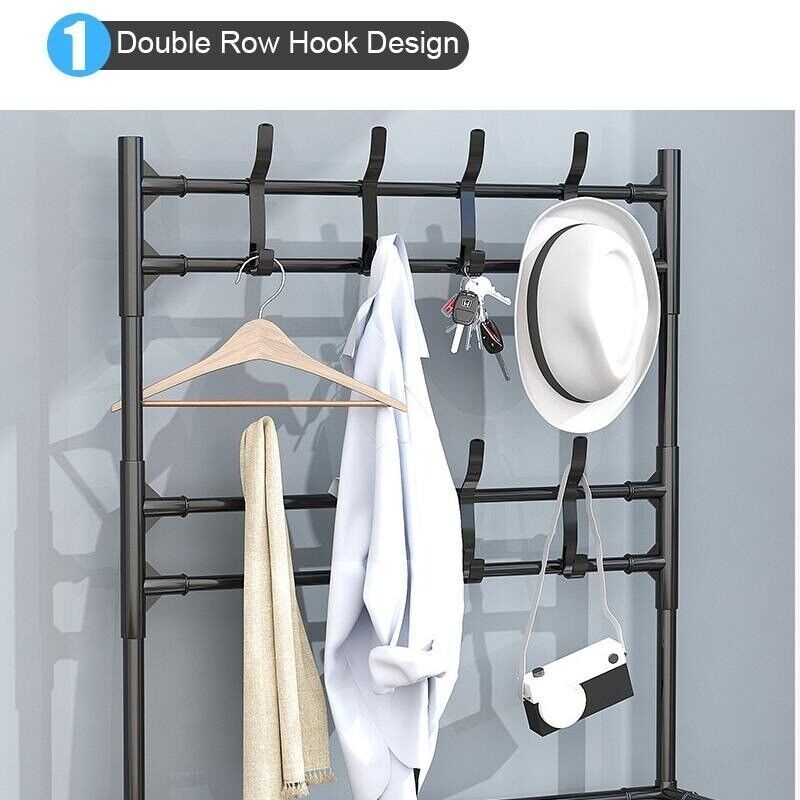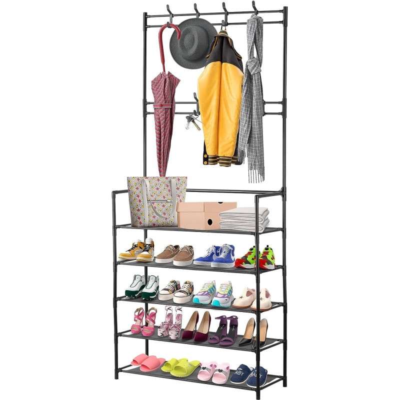 С комбиниран 3в1 дизайн – разполага със стойки за шапки, закачалки за дрехи и рафтове за обувки.