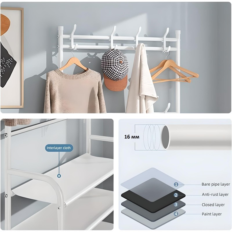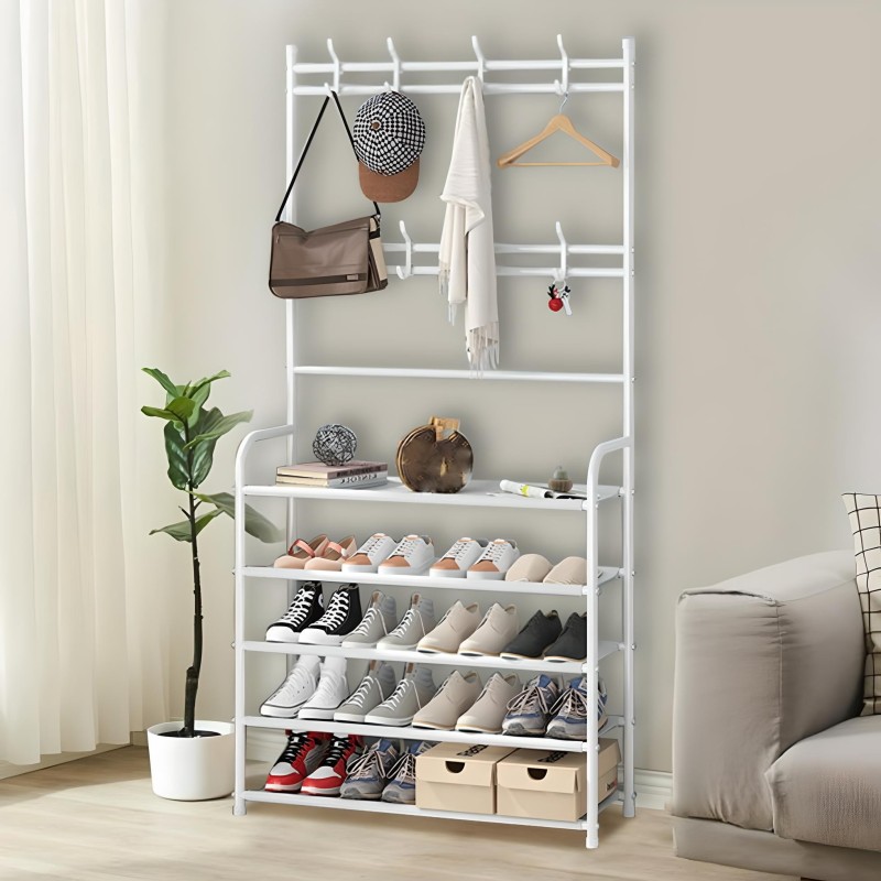 С комбиниран 3в1 дизайн – разполага със стойки за шапки, закачалки за дрехи и рафтове за обувки.
