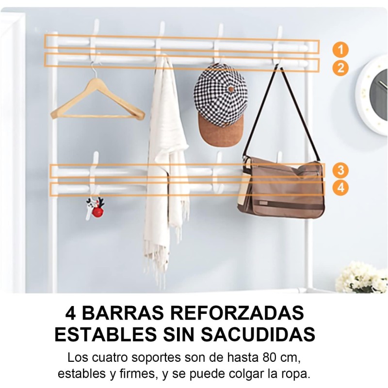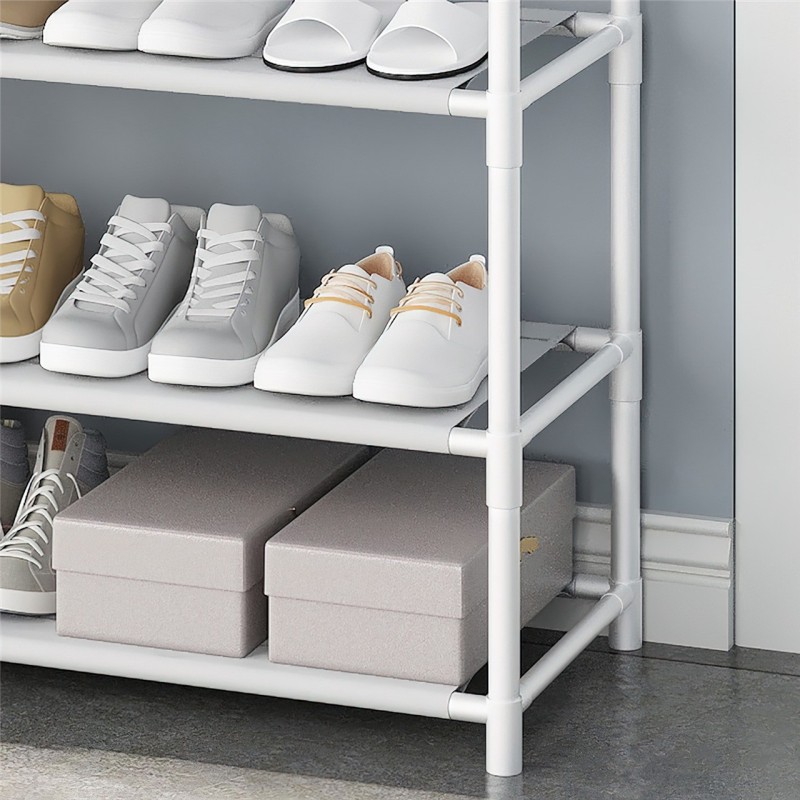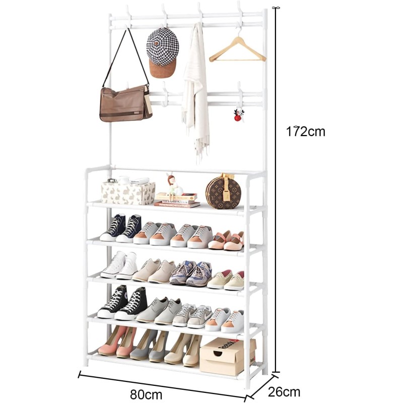 Монтажът и сглобяването на закачалката с рафтове за обувки се случва бързо и лесно. Снабдена е с 5 рафта и 8 закачалки на две нива. Въведете ред в дома си с практичния стелаж за обувки, дрехи и други принадлежности.