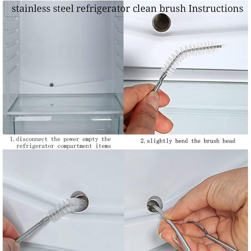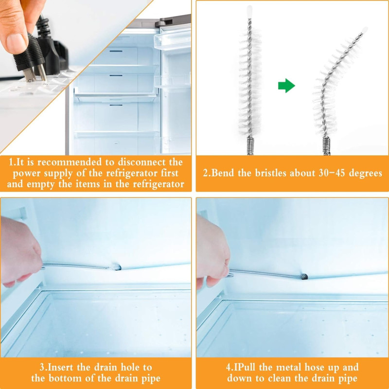Тези помощни средства ефективно премахват всички натрупани частици храна, мръсотия или други остатъци, които могат да причинят запушвания и да забавят движението. Този комплект съдържа всичко необходимо, за да предпазите дренажния отвор на Вашия хладилник от запушвания и мръсотия.