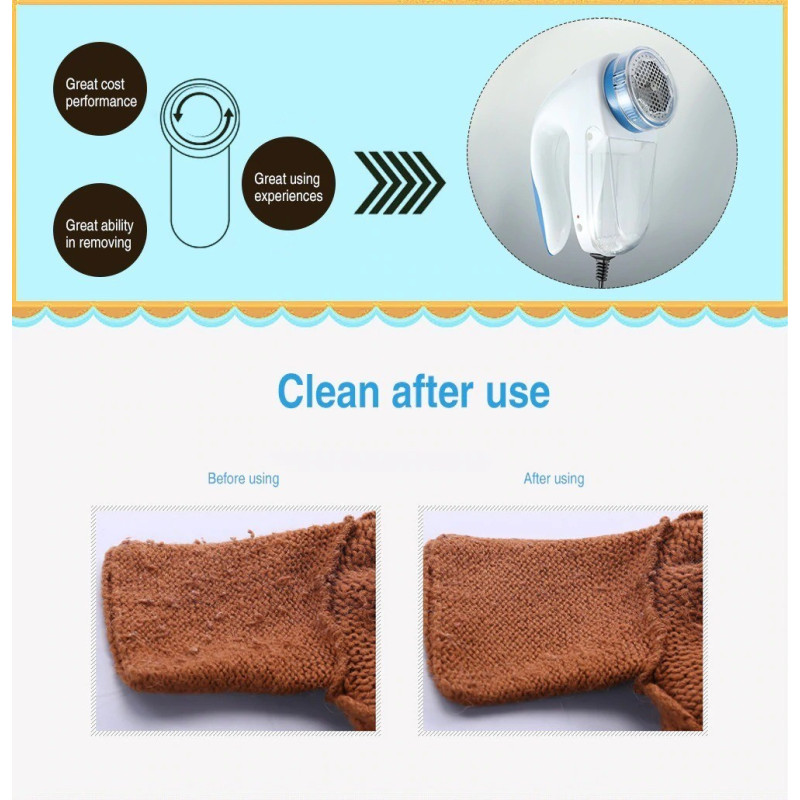 Със своите ротационни ножчета и стабилно захранване на ток (220V), машинката предлага изключителна ефективност и безопасност за всички материи – от деликатни плетива до плътни тъкани. Забравете за неприятните топчета и мъх, които загрозяват дрехите и мебелите ви. Благодарение на иновативния си дизайн и удобна дръжка, уредът е лесен за употреба и изключително удобен за дълготрайна работа.