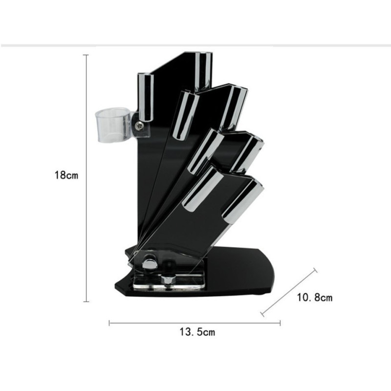 Оригиналната акрилна стойка е не само стилно допълнение към комплекта, но и практично решение за съхранение на ножовете. Тя има размери 18х13.5х10.8 см и ще ви помогне да подредите ножовете на едно място, където винаги ще бъдат под ръка.