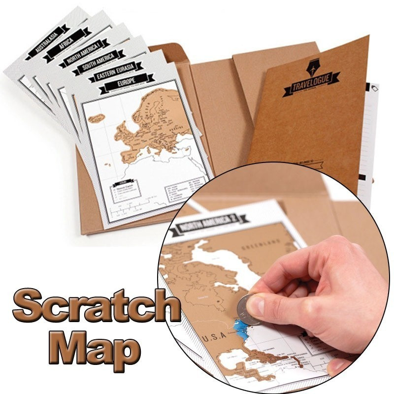 Този дневник разполага с две отделения от вътрешната страна на корицата. В едното отделение са поставени 8 скреч карти, представящи различни континенти. Когато посетиш дадена дестинация, просто изтрий страната на картата, която си посетил, и златистото фолио ще придобие нов цвят. Това е прекрасен начин да проследиш своите пътешествия и да създадеш планове за бъдещи приключения.