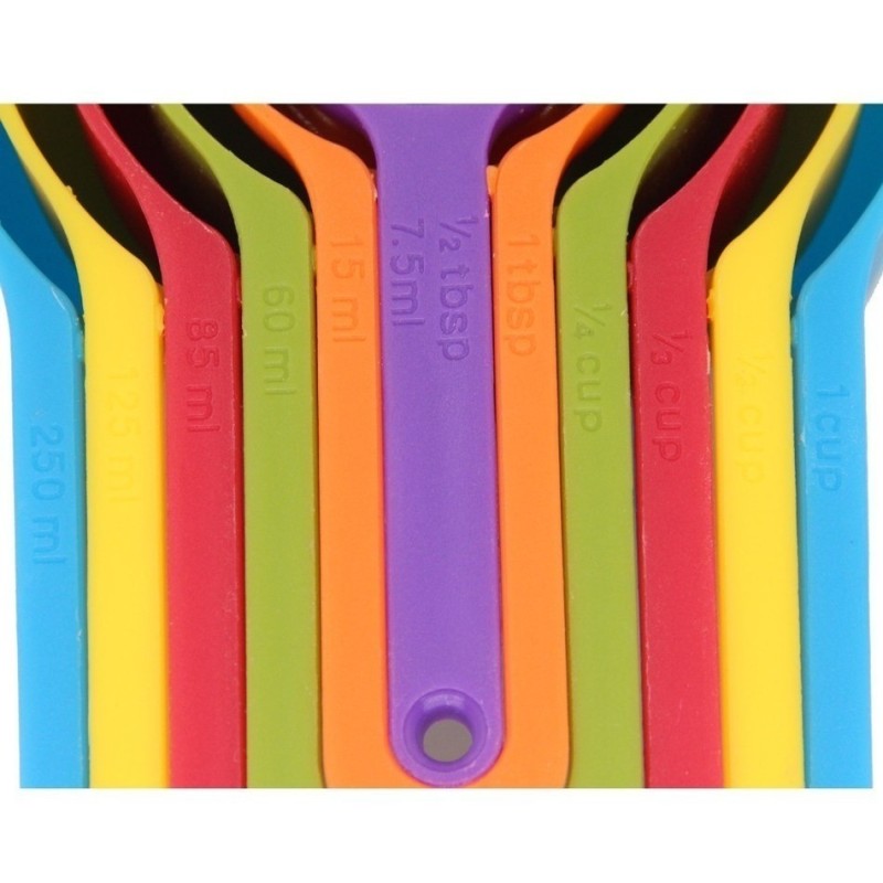 Нашите мерителни лъжички имат няколко предимства. Първо, различната им вместимост ви позволява да измервате различни количества съставки в зависимост от вашите нужди. Второ, ярките цветове на лъжиците придават на кухнята ви свеж и жизнен вид. Трето, лъжиците могат да бъдат закачени на куки за по-лесен достъп и удобство.