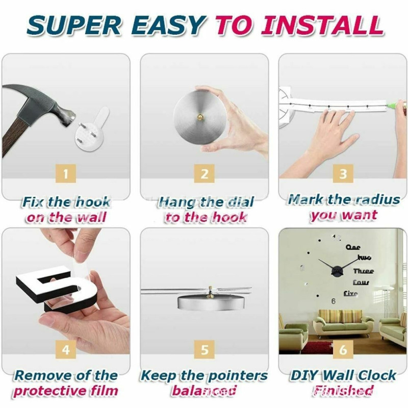 Този часовник е снабден с безшумен и точен механизъм. Монтажът е бърз и лесен - просто поставете образеца върху стената и фиксирайте с малко тиксо. След това очертайте празните места с молив и точици. След като отлепите предпазните лепенки, поставете цифрите и точките на местата, които сте избрали. След като поставите батерията и настроите точното време, вашето ново творение е готово!