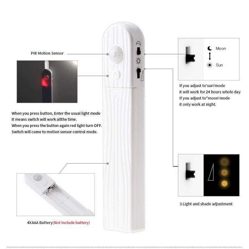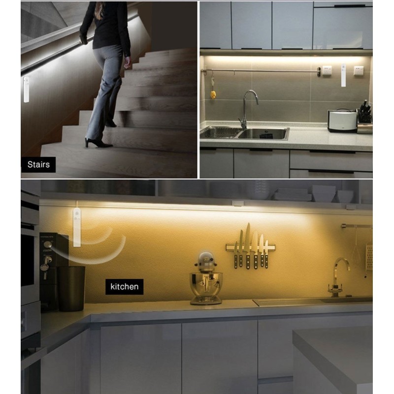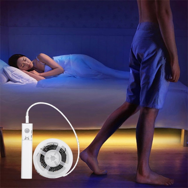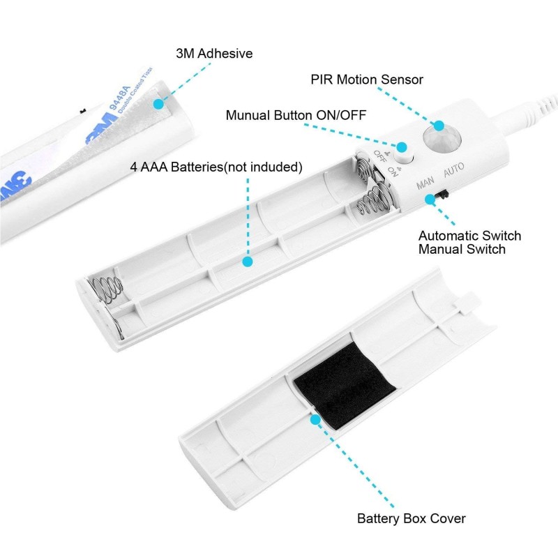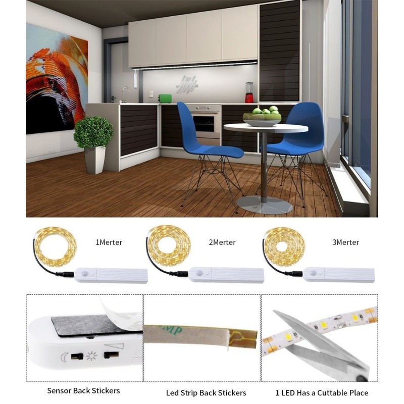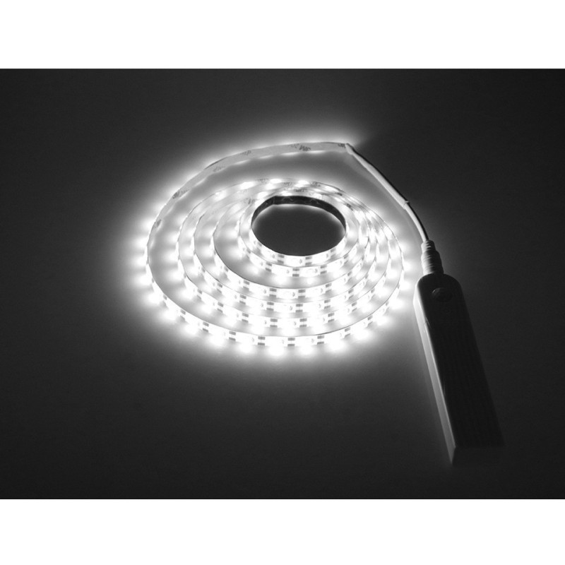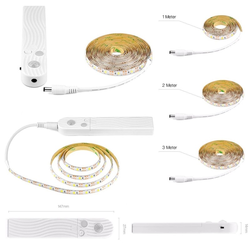 Този комплект включва LED лента с дължина от 1, 2 или 3 метра, която можете да изберете от менюто под цената. PIR датчикът за движение има обхват от 2 до 4 метра. Захранва се с 4 батерии ААА (които не са включени). В комплекта са включени LED лента, контролер със сензор за движение и самозалепваща лента за контролера.