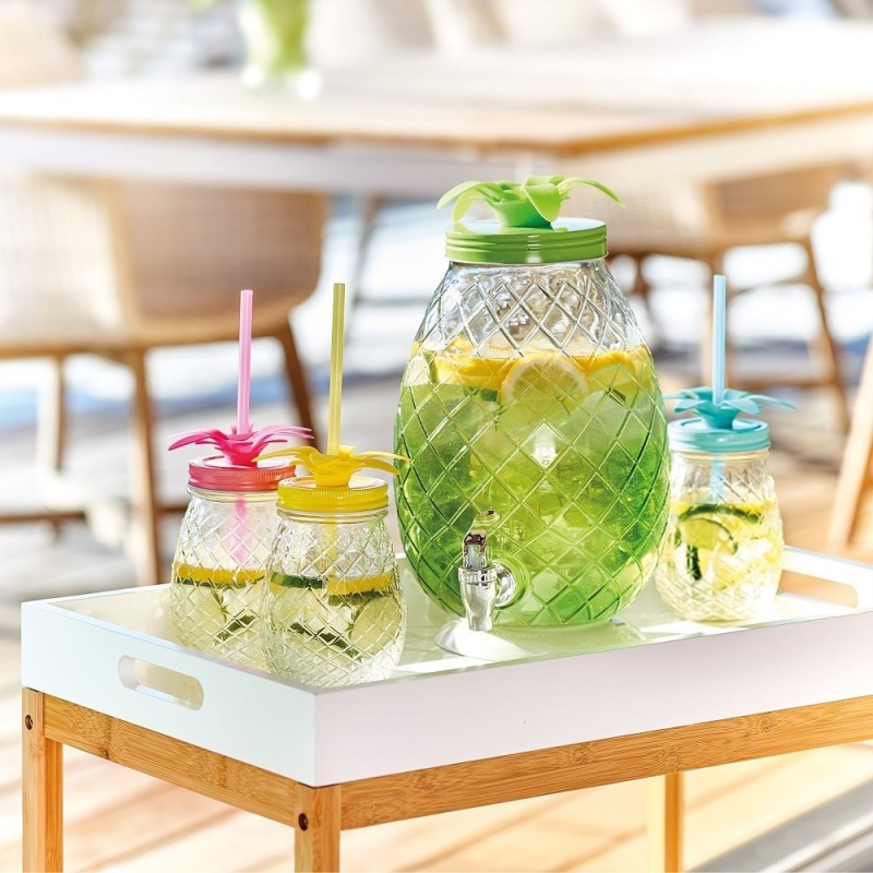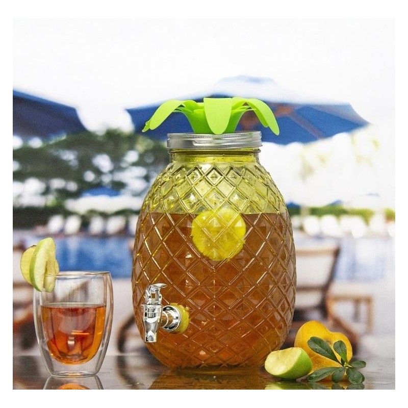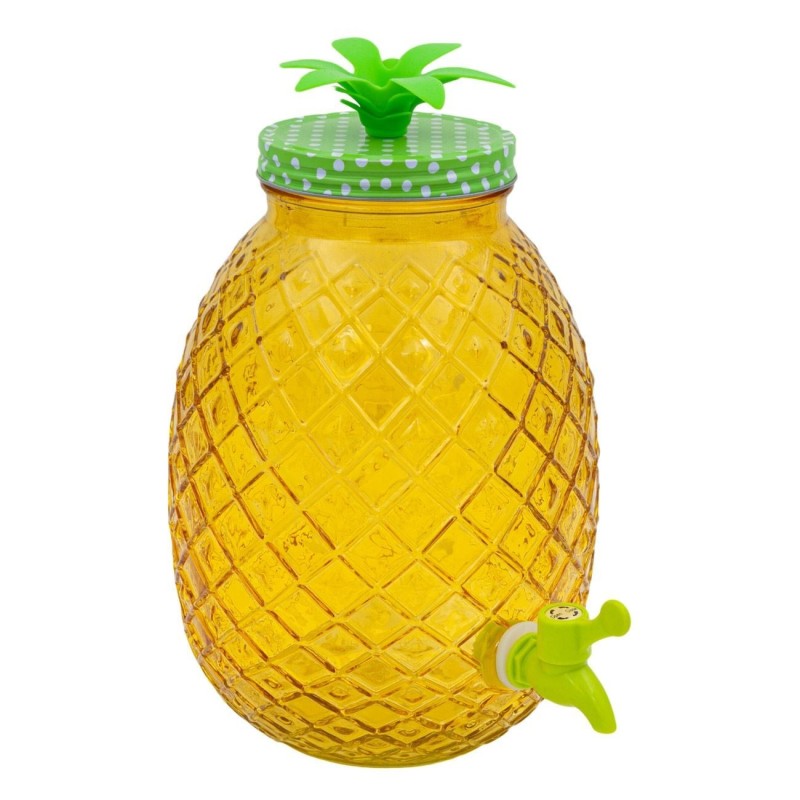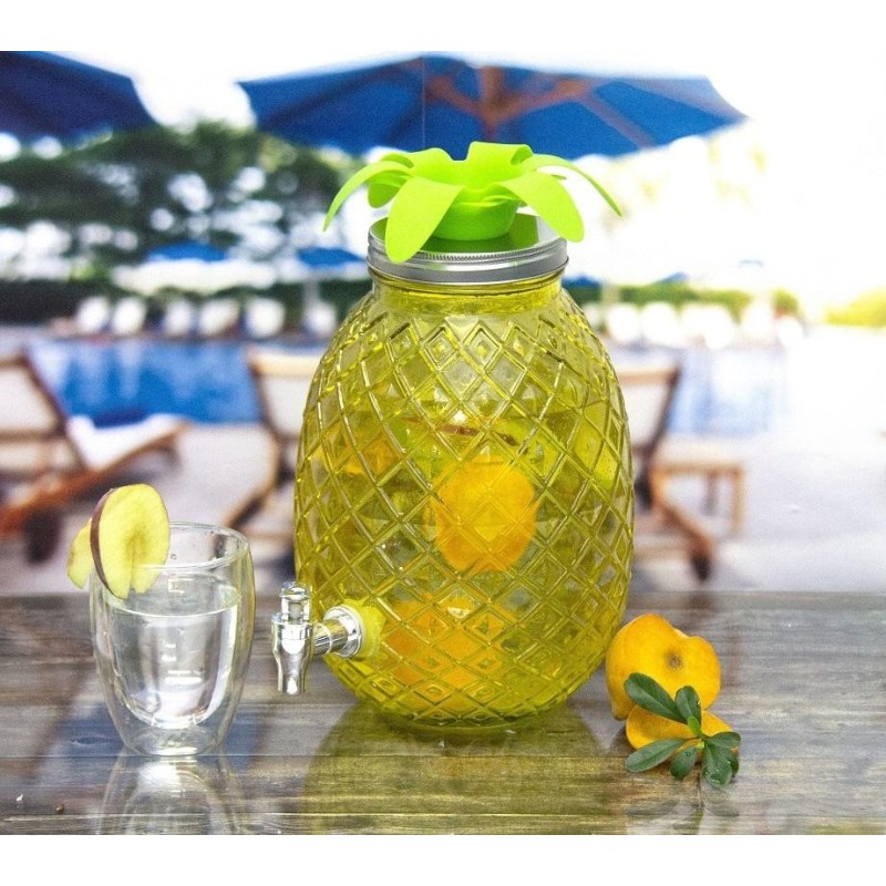 Насладете се на свежи напитки със стъклен буркан със форма на ананас. Този ретро буркан с кран е идеален за летните дни, когато искате да се насладите на вкусни лимонади, алкохолни напитки, коктейли или сангрии. С широкото гърло на буркана можете лесно да го напълните с лед или нарязани плодове, за да добавите още аромат и свежест на вашите напитки.