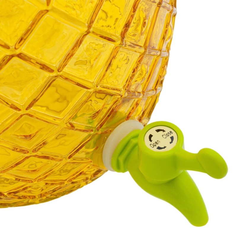 Този стъклен буркан с форма на ананас има стилно жълто оцветяване, което го прави перфектен аксесоар за вашата лятна трапеза или партита. Неговите размери са ширина 17 см и височина 30 см, с воден обем от 5 литра.