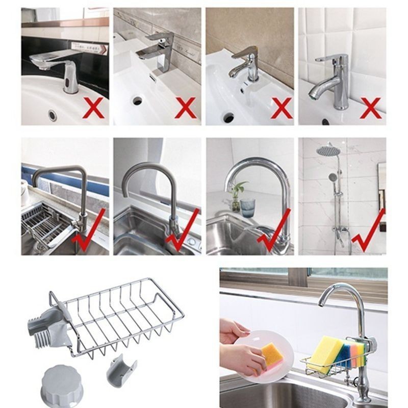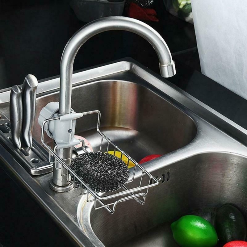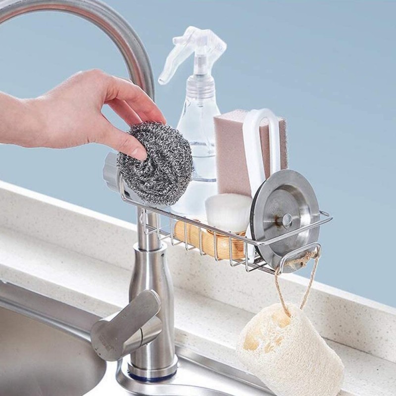 Метална поставка за гъба и сапун с монтаж за смесителната батерия на кухненска мивка или душ