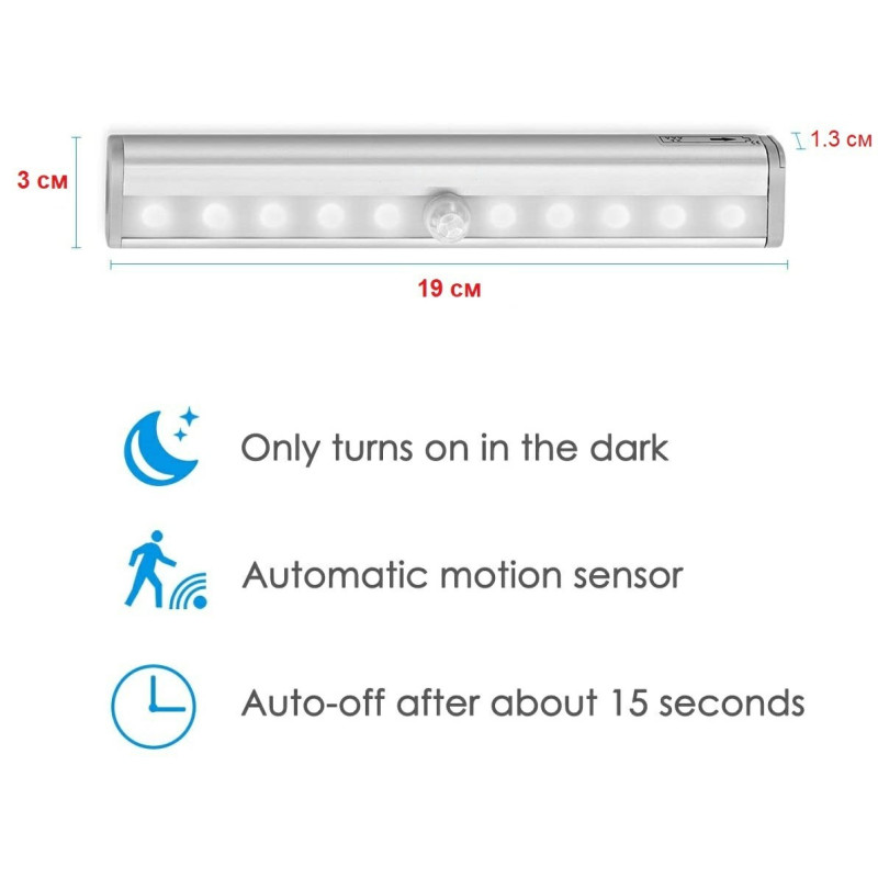 - Размер на лампа с 10 LED: 19 Х 1.5 Х 3 см;