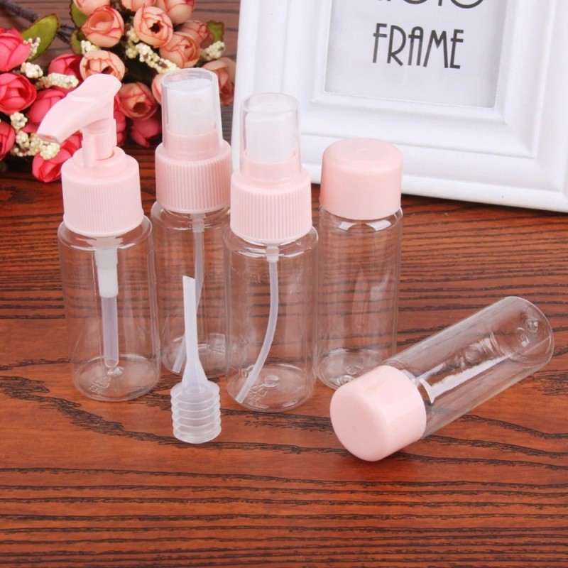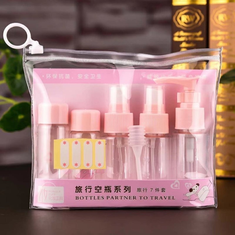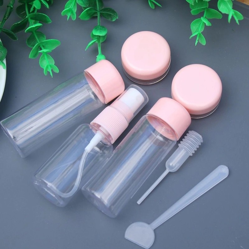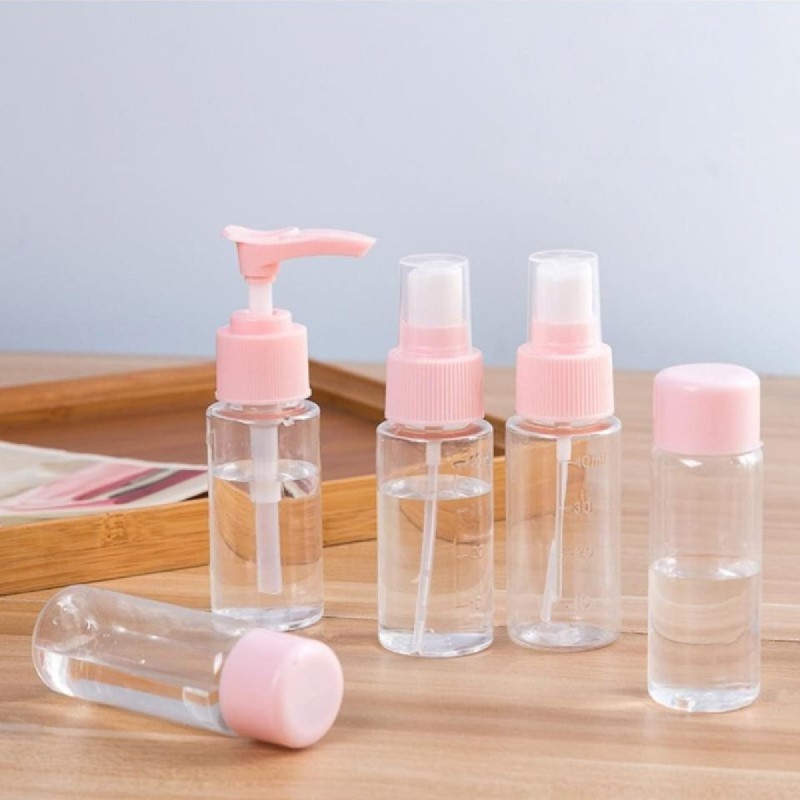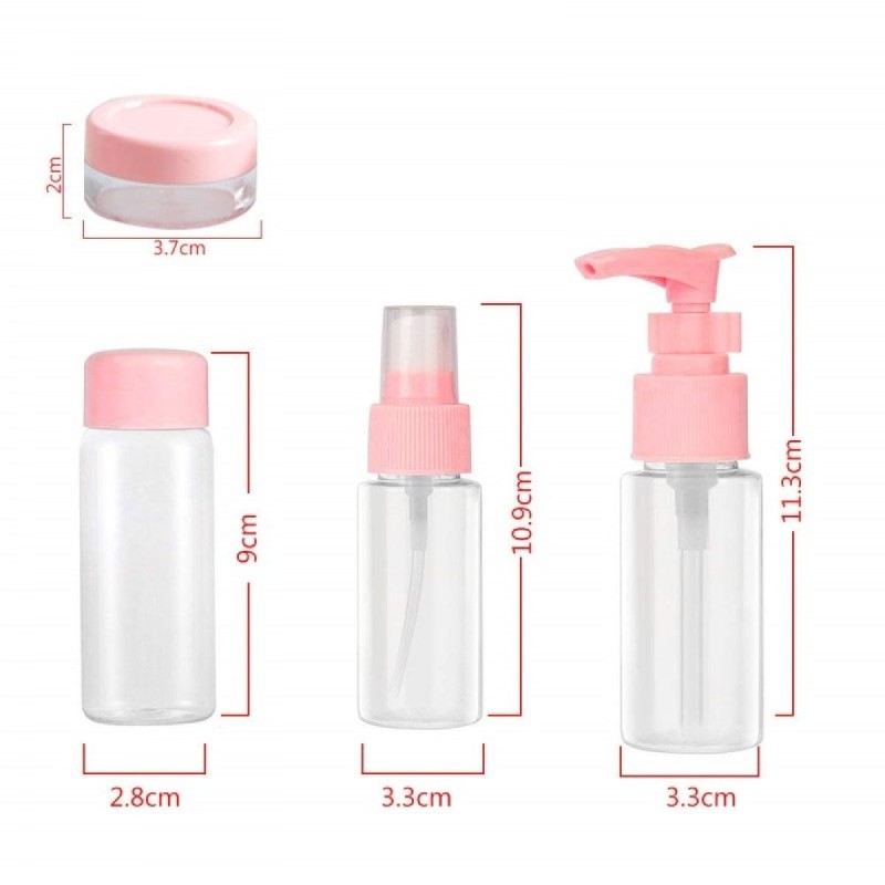 Комплектът е снабден с различни типове шишенца - с помпа, със спрей, с винтова капачка и пипетка с помпа, което гарантира удобство и лесно използване на всякакъв вид продукти. Освен това, в комплекта включени и 5 броя етикети, които ви позволяват да маркирате всяко шишенце със съответния продукт.
