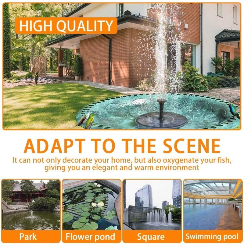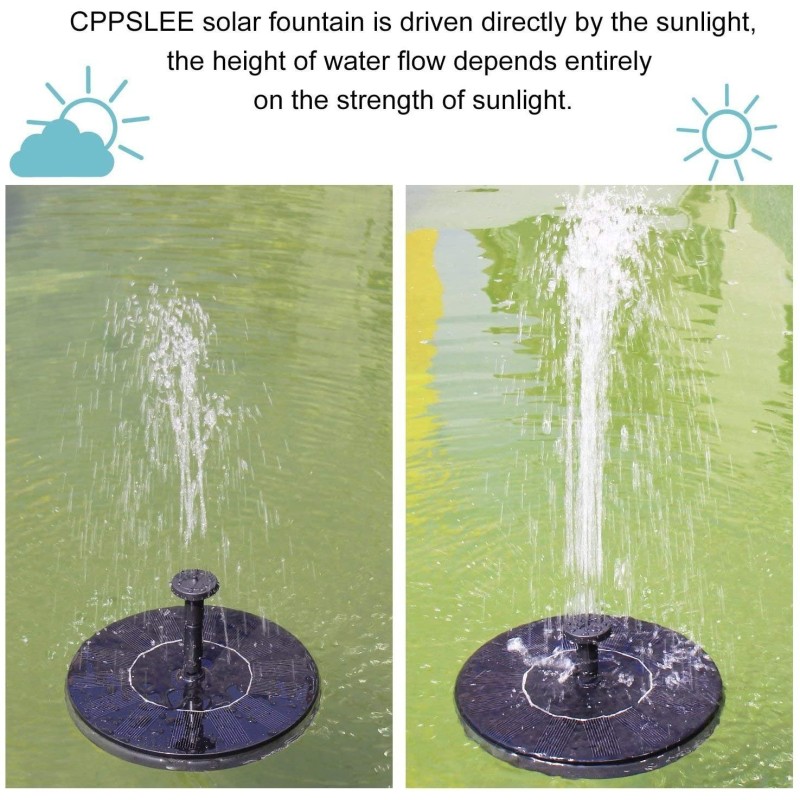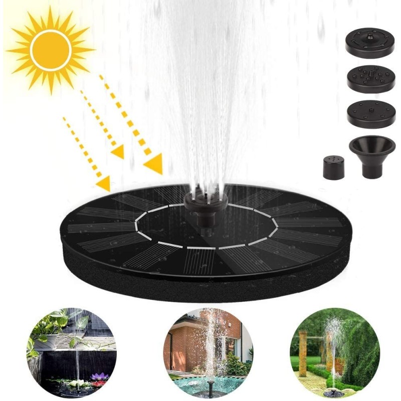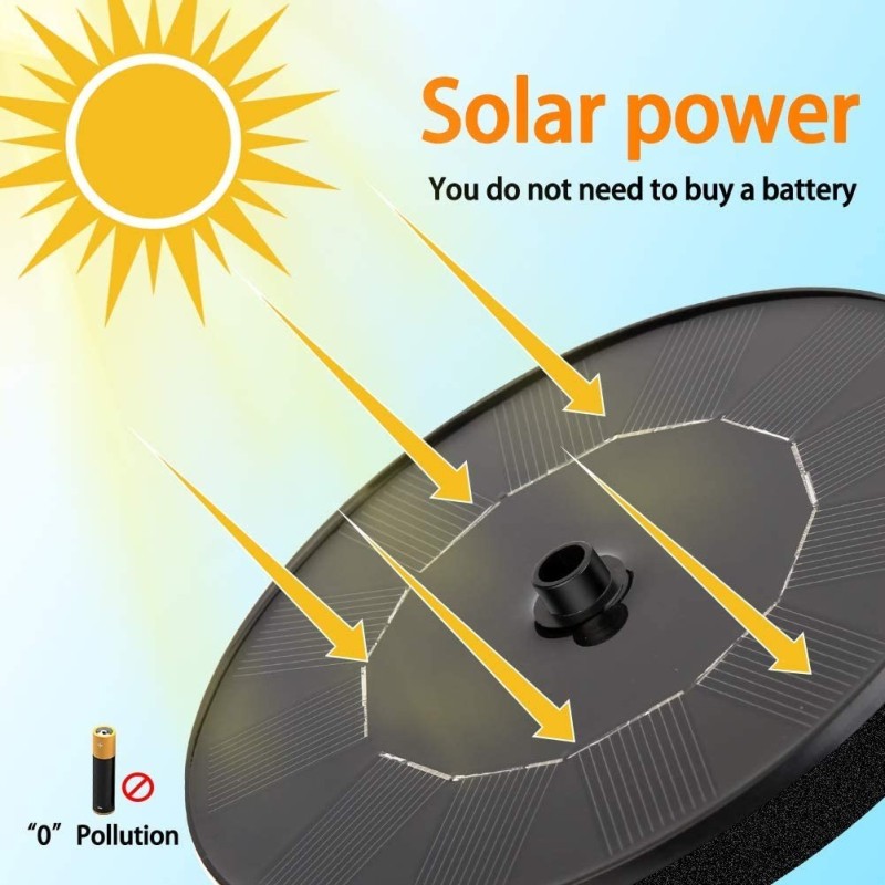 Този продукт е изцяло съобразен с природата и представлява съчетание от кръгъл соларен панел и помпичка, която автоматично се захранва от слънчевата енергия. С помощта на накрайник, който е включен в комплекта, водата се разпръсква под различни форми и височини на струята, което допринася за атмосферата на спокойствие и хармония в градината ви.
