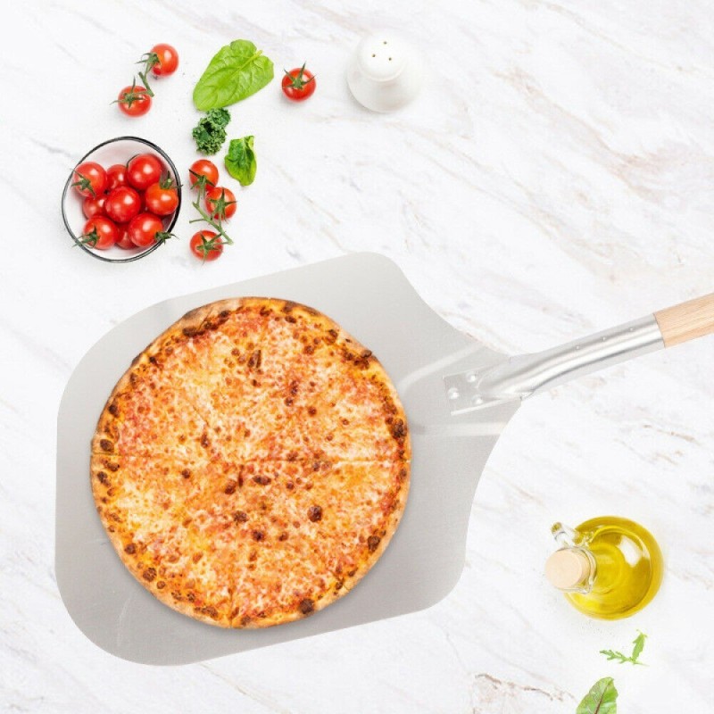 "Представяме ви аксесоара, който ще направи печенето във вашата пещ по-лесно и безопасно - Лопата за пица и хляб с дървена дръжка. Тя е идеална за поставяне и изваждане на пицата от фурната, без да се налага да балансирате или рискувате да изпуснете пицата си. Алуминиевата повърхност на лопатата е изключително тънка, което ви позволява лесно да плъзнете под тестото на пицата и да я извадите без усилие.