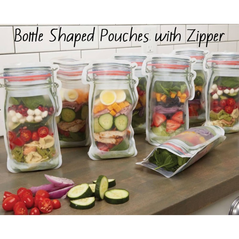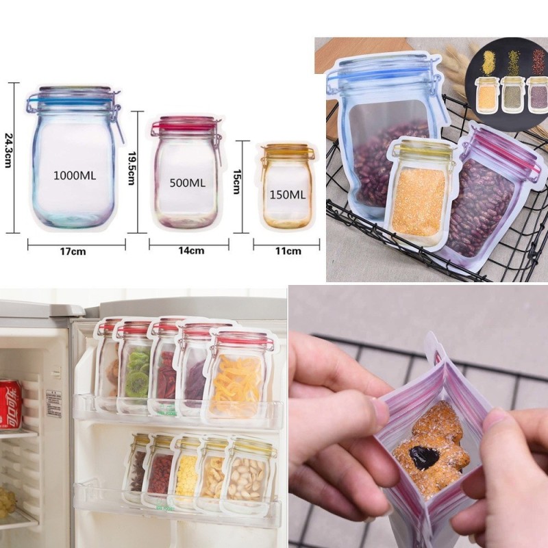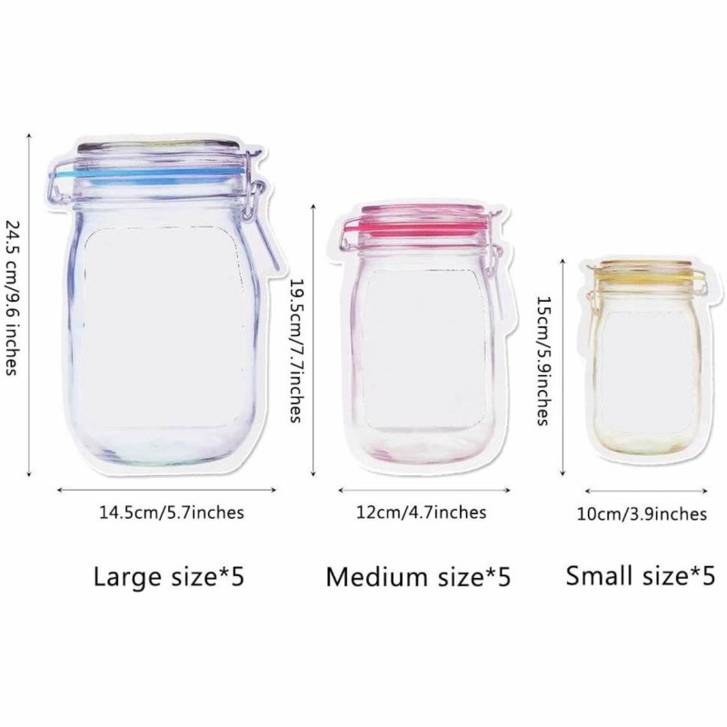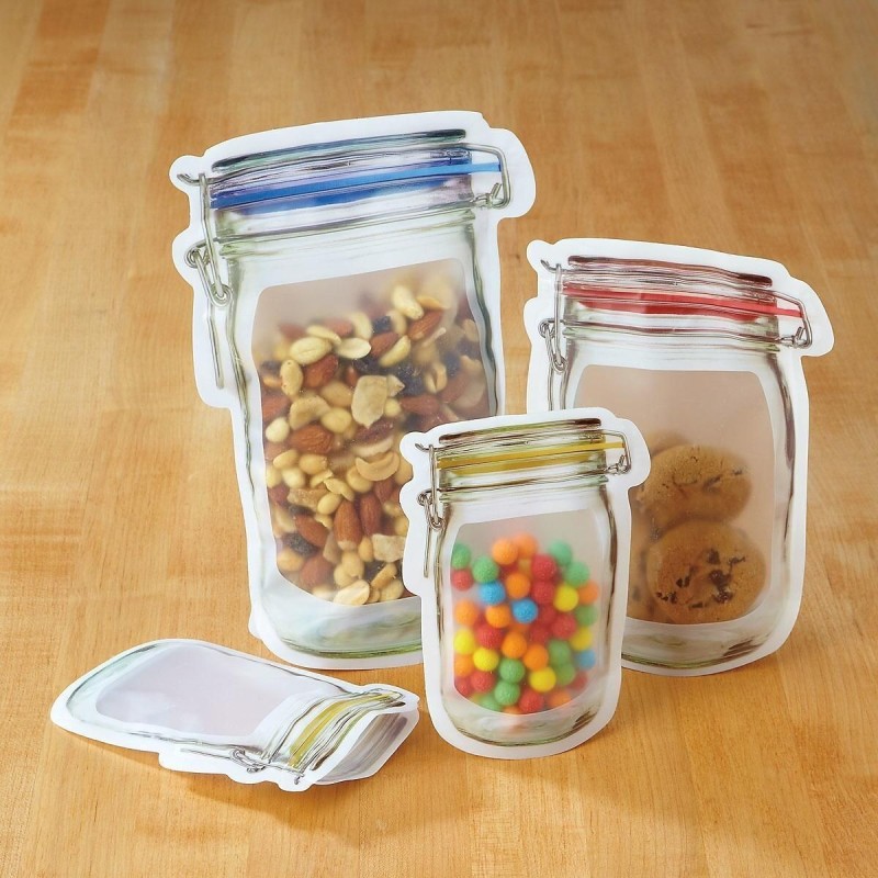 Предлагаме ви два комплекта от тези удивителни клипс торбички за съхранение с форма на бурканчета Mason Jar. Комплект 1 включва 3 големи, 4 средни и 3 малки торбички, докато комплект 2 включва 3 големи, 4 средни, 4 малки и 1 дълга торбичка.