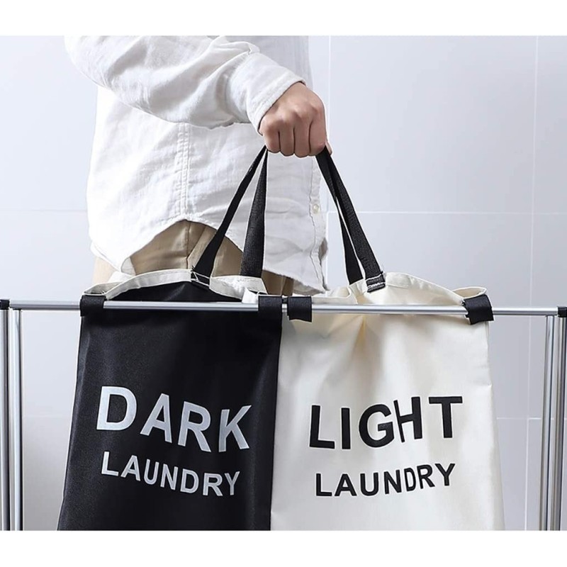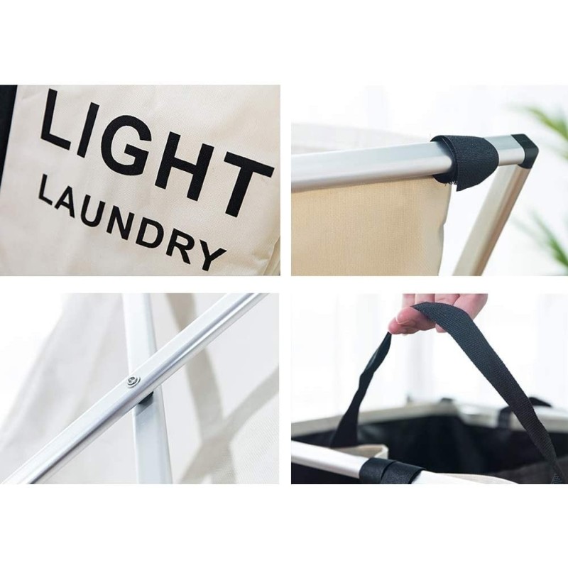 Чантите за пране са изработени от висококачествен, издръжлив полиестер, който е лесен за поддръжка. Те са стабилно прикрепени към здравата дървена рамка на коша, която осигурява стабилност и дълготрайност. Торбите за пране са съединени заедно, така че можете да ги изпразните едновременно и да спестите време и усилия.