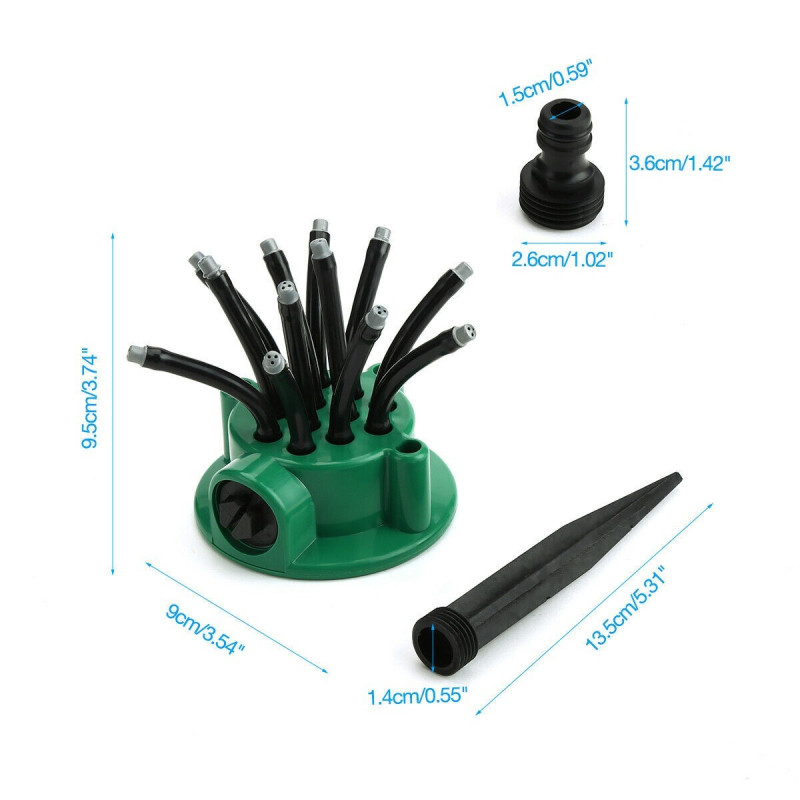 Тази пръскачка е подходяща за поливане на цветни лехи, странични дворове, тревни площи, тераси, дворове, зеленчукови градини, растения и общо градинско напояване. Размерите на пръскачката са 9 * 10 (D * H), а вътрешният диаметър на интерфейса е 0,9 см, а външният - 1,5 см. Дължината на вложката е около 13,5 см.