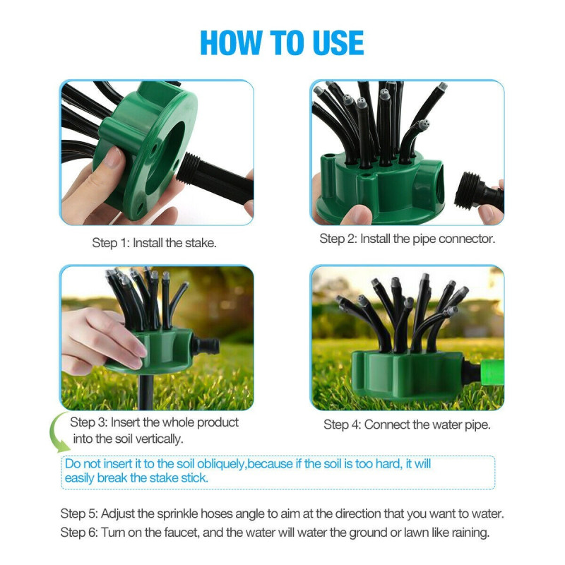 Употребата на тази пръскачка е изключително лесна - просто свържете маркуча към пръскачката и започнете поливането. С гъвкавата 360 градусова пръскачка вече няма да трябва да прекарвате часове в поливане, тъй като тя осигурява автоматично напояване на вашата градина или тревна площ, дори без ваше присъствие.