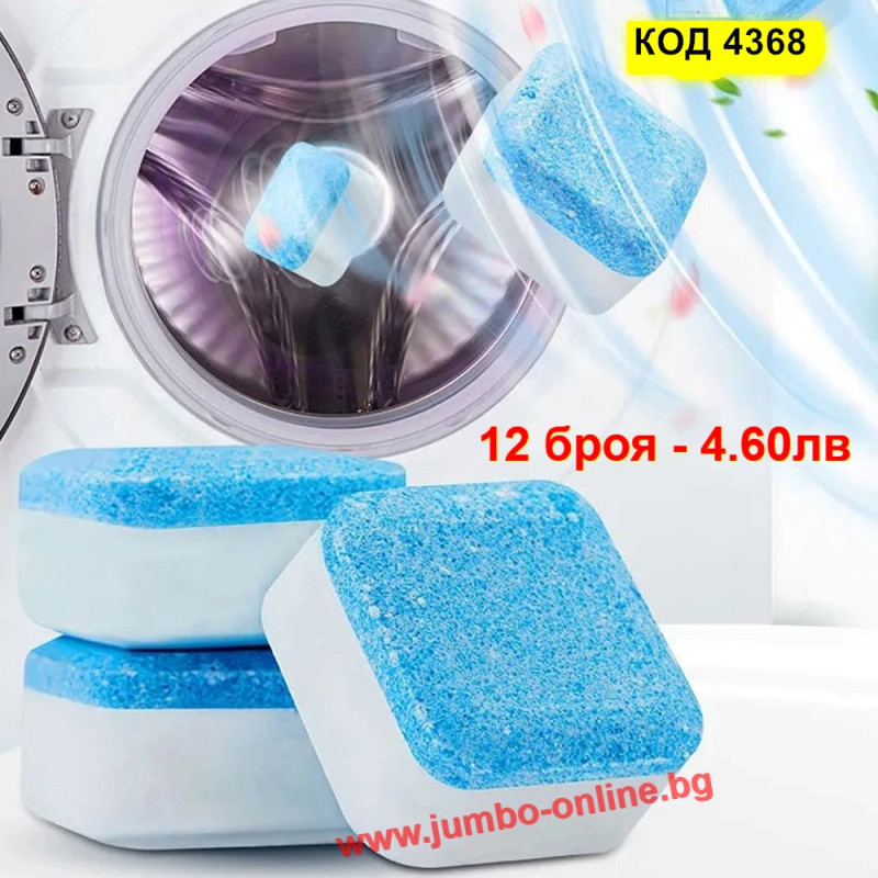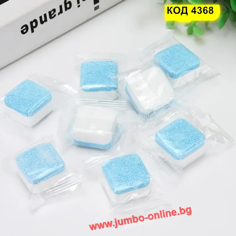12 броя таблетки за почистване на пералня, всяка опакована в индивидуална опаковка