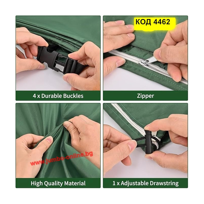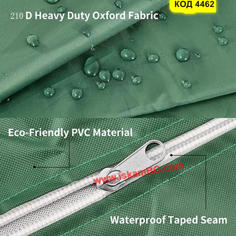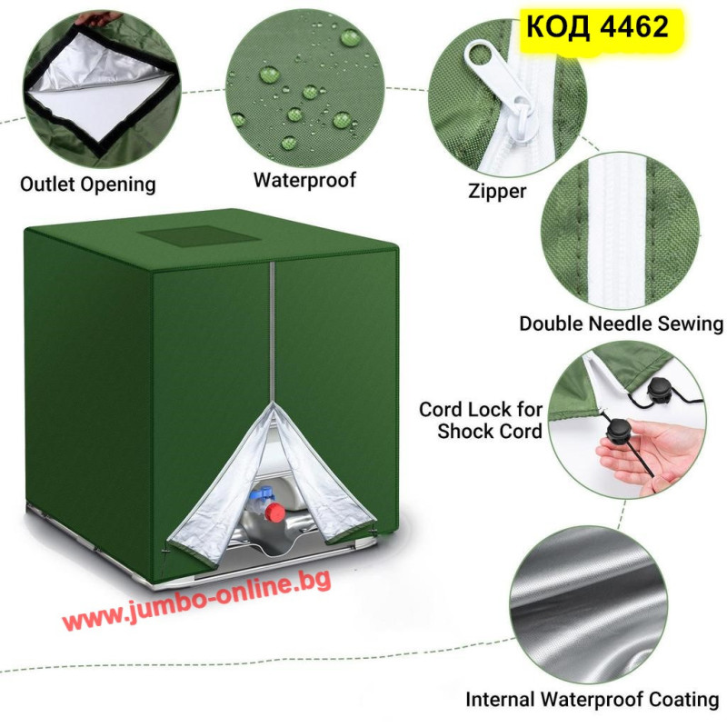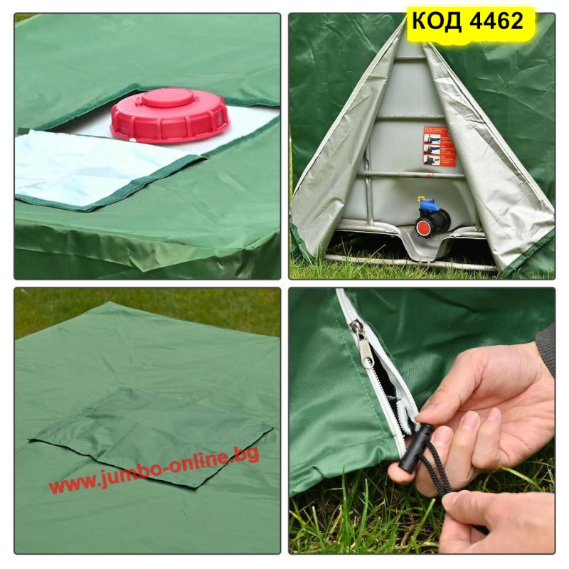 Това покривало за IBC контейнер 1000 л е създадено да осигури надеждна защита на резервоара за вода при външни условия. Изработено от здрав и водоустойчив 210D Оксфорд плат, то предпазва от UV лъчи, дъжд, прах, сняг и други замърсители. Вградените цип и отвор за капачката позволяват лесен достъп до съдържанието на контейнера, без да е нужно сваляне на цялото покритие.