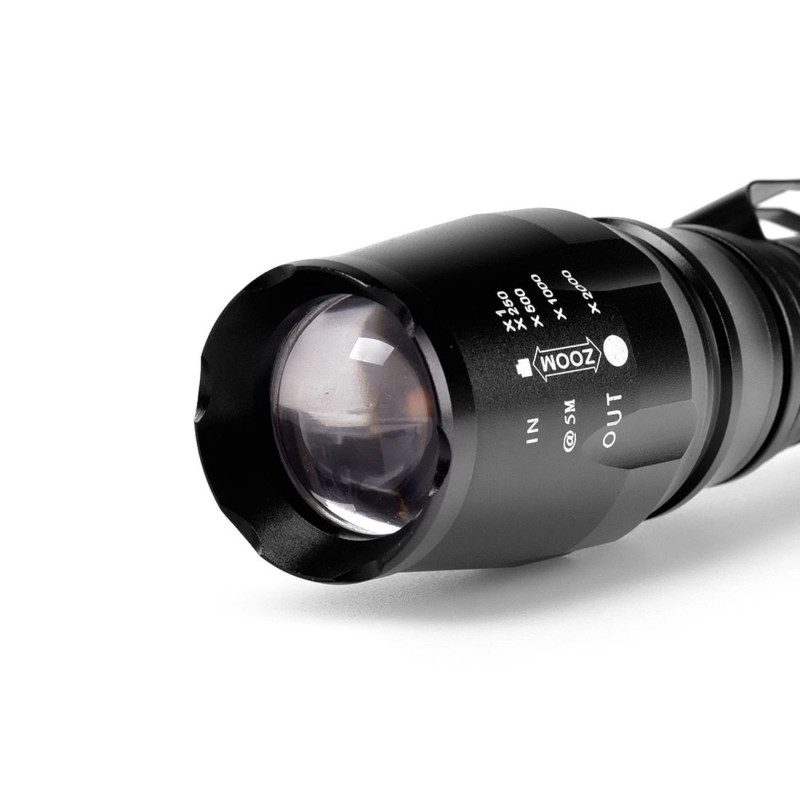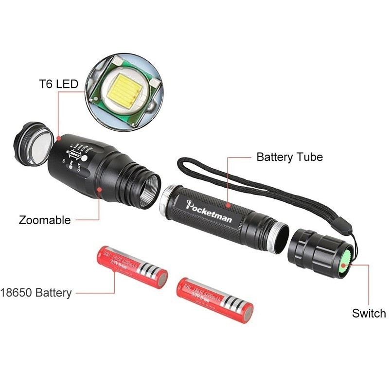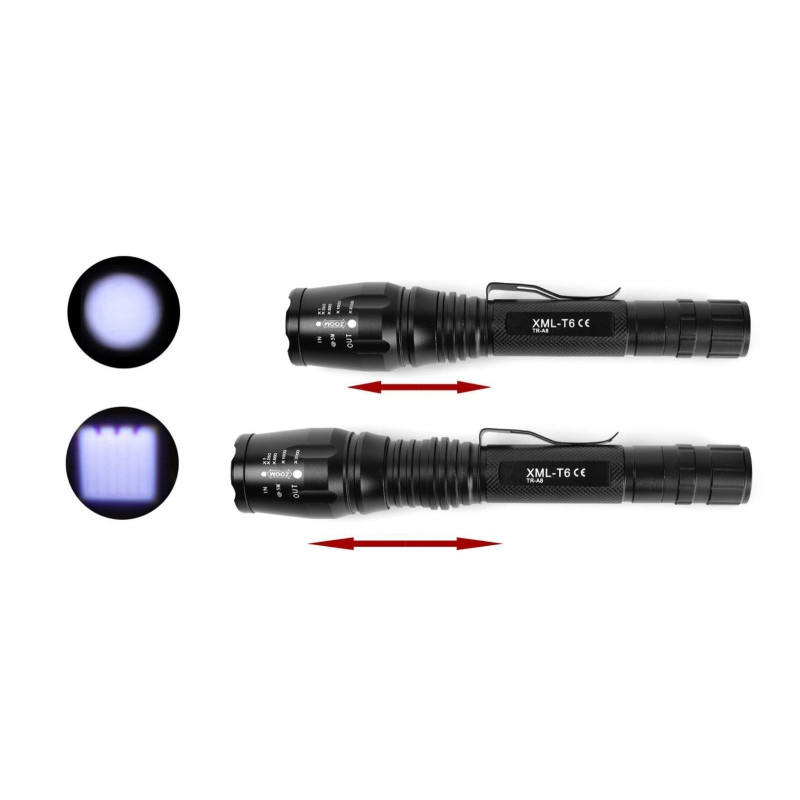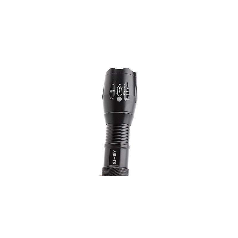 Техническите характеристики на този фенер включват: цвят - черен, модел - XML-T6, осветление - Cree LED, материал на корпуса - алуминий, фокусиране на светлинният лъч - Zoom, мощност на LED диода - 3W, водоустойчивост IP65, удароустойчивост, зареждане от ел. мрежа или автомобилна запалка, захранване с две презареждаеми батерии 18650 - 6800 и 4 режима на светене - слабо, средно, силно и SOS.