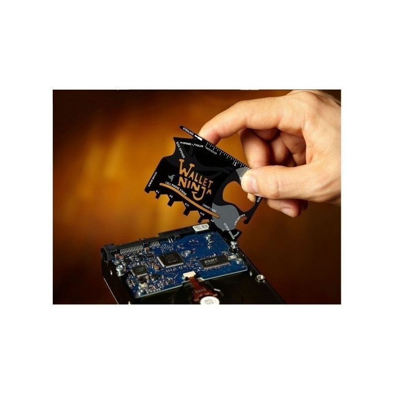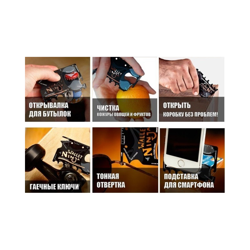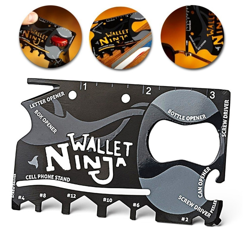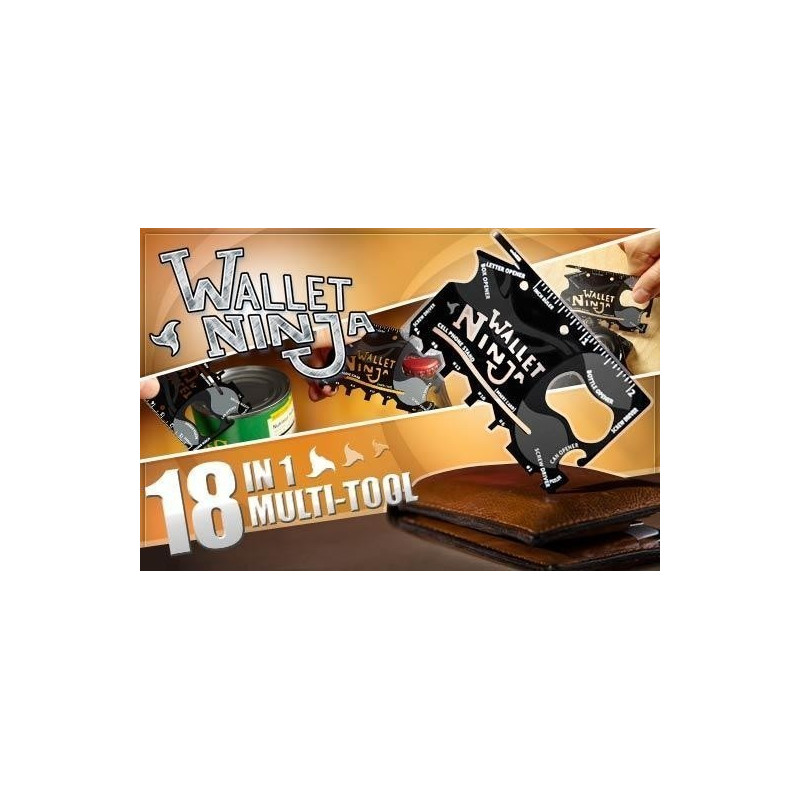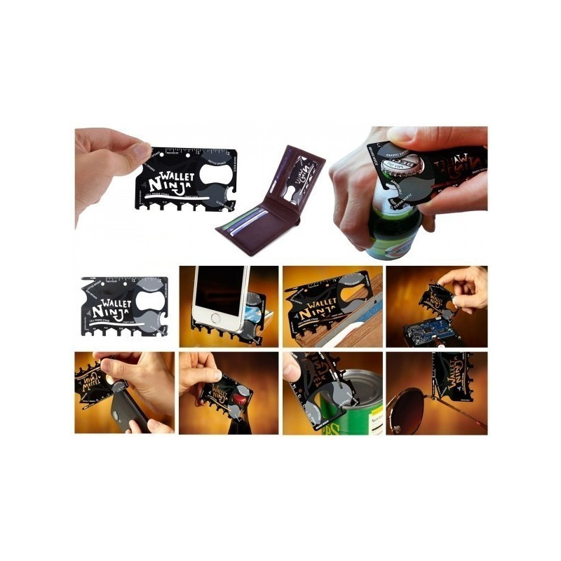 Wallet ninja 18 в 1 комбинира в себе си множество инструменти, които лесно ще ви помогнат в ежедневието. С него можете да завивате болтове, да отваряте консерви или бутилки, да режете хартия и още куп други дейности. Не само това, с малко въображение можете да го използвате и като поставка за смартфон, създавайки си допълнително удобство.