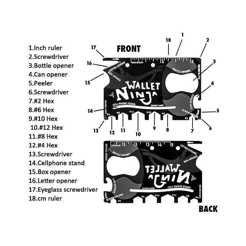 Включващ отварачка за бутилки, отварачка за консерви, приспособление за отваряне на писма, приспособление за изваждане на пирончета, линийка в сантиметри и инчове, стойка за смартфон, белачка за плодове и зеленчуци, четири различни отвертки и шест гаечни ключа, Wallet ninja 18 в 1 ще ви спести средства и нуждата от закупуване на всички тези инструменти.