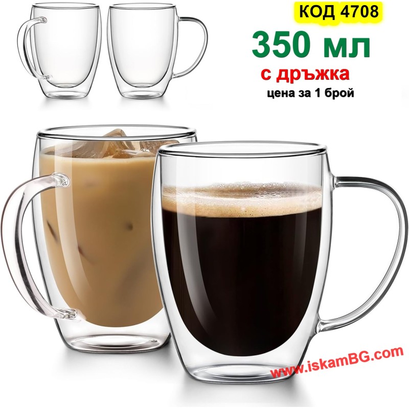 1 брой стъклена двустенна чаша за кафе с вместимост 350 мл (с дръжка)